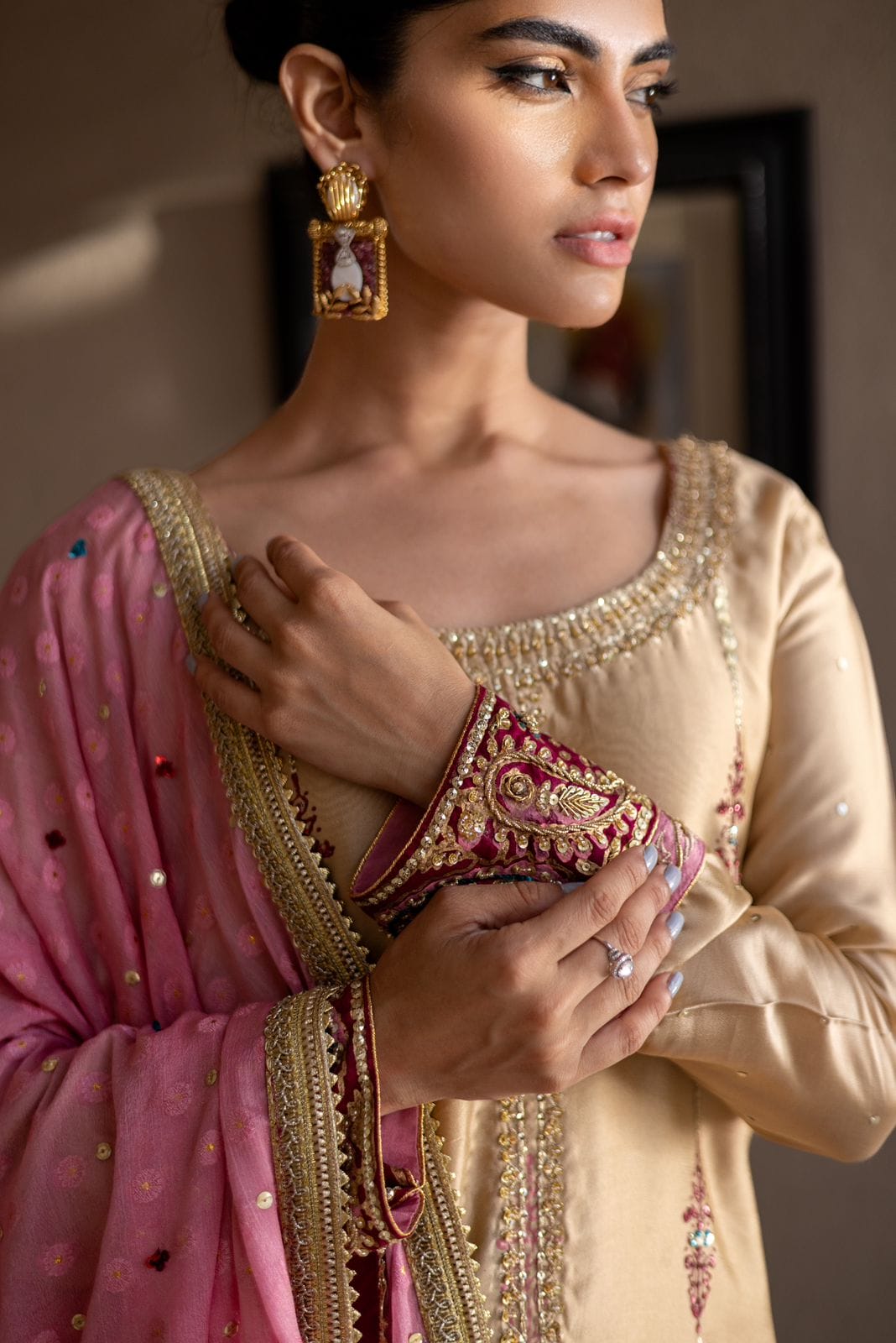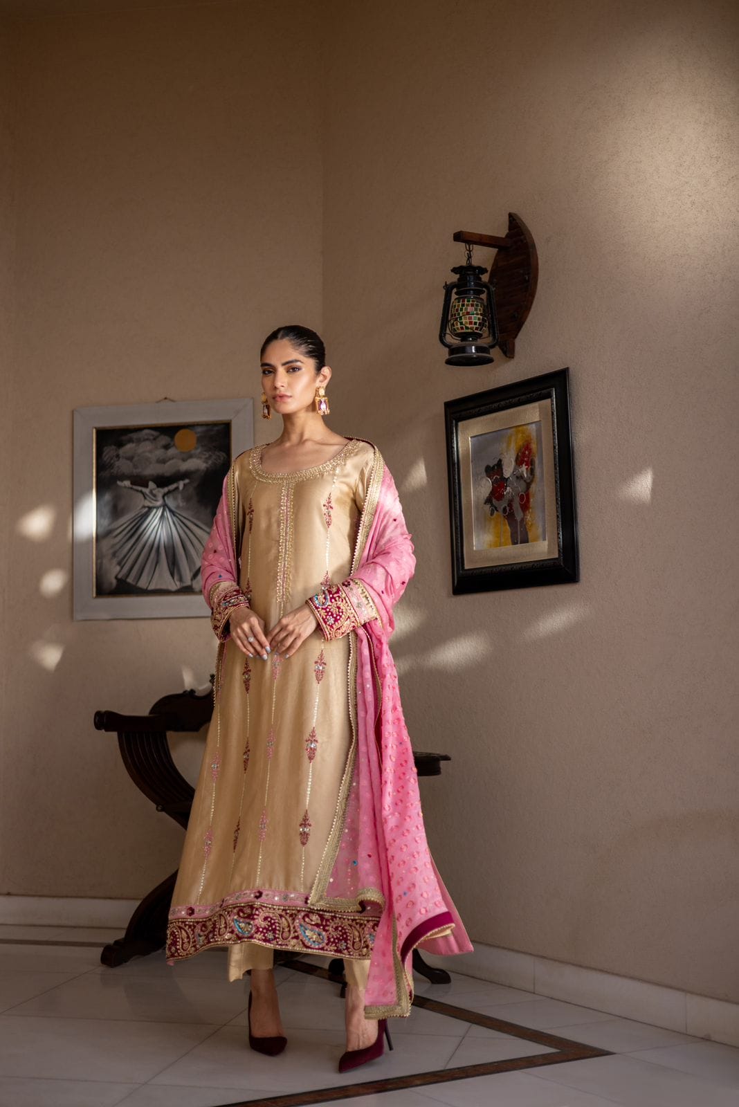 The traditional shades of gold, maroon, and pink create a stunning palette for this ensemble. The block print adds a unique touch, while the hand embellishments enhance its beauty. A Banarasi chiffon dupatta beautifully completes the look, adding elegance and sophistication.