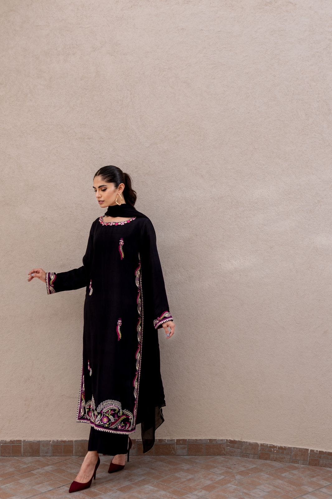 Black is the timeless color for every season, and this exquisite black raw silk outfit is a true statement piece. Adorned with vibrant multi-color embroidery, and elevated with rich hues of gold, Kora dabka, and delicate sequins, this design effortlessly combines traditional craftsmanship with modern flair. Perfectly suited for the wedding season, it promises to make you the center of attention at any celebration.