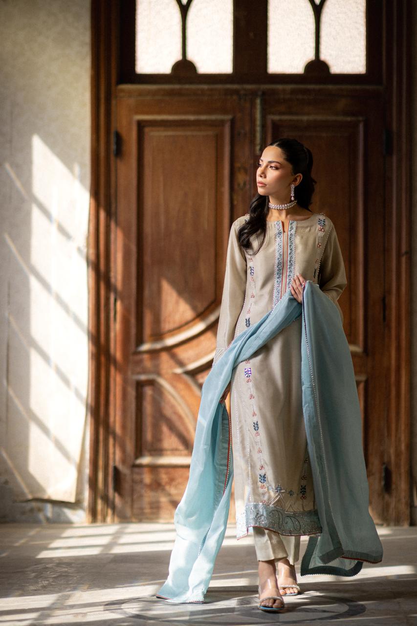 “Embodying the perfect blend of elegance with soft hues of Norge and ice blue, brought to life with intricate embroidery and hand embellishments. A masterpiece that whispers sophistication. ❄️