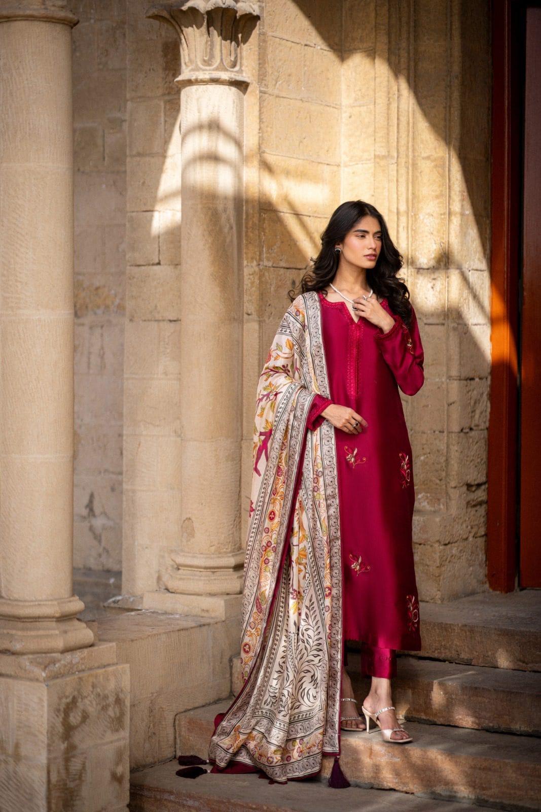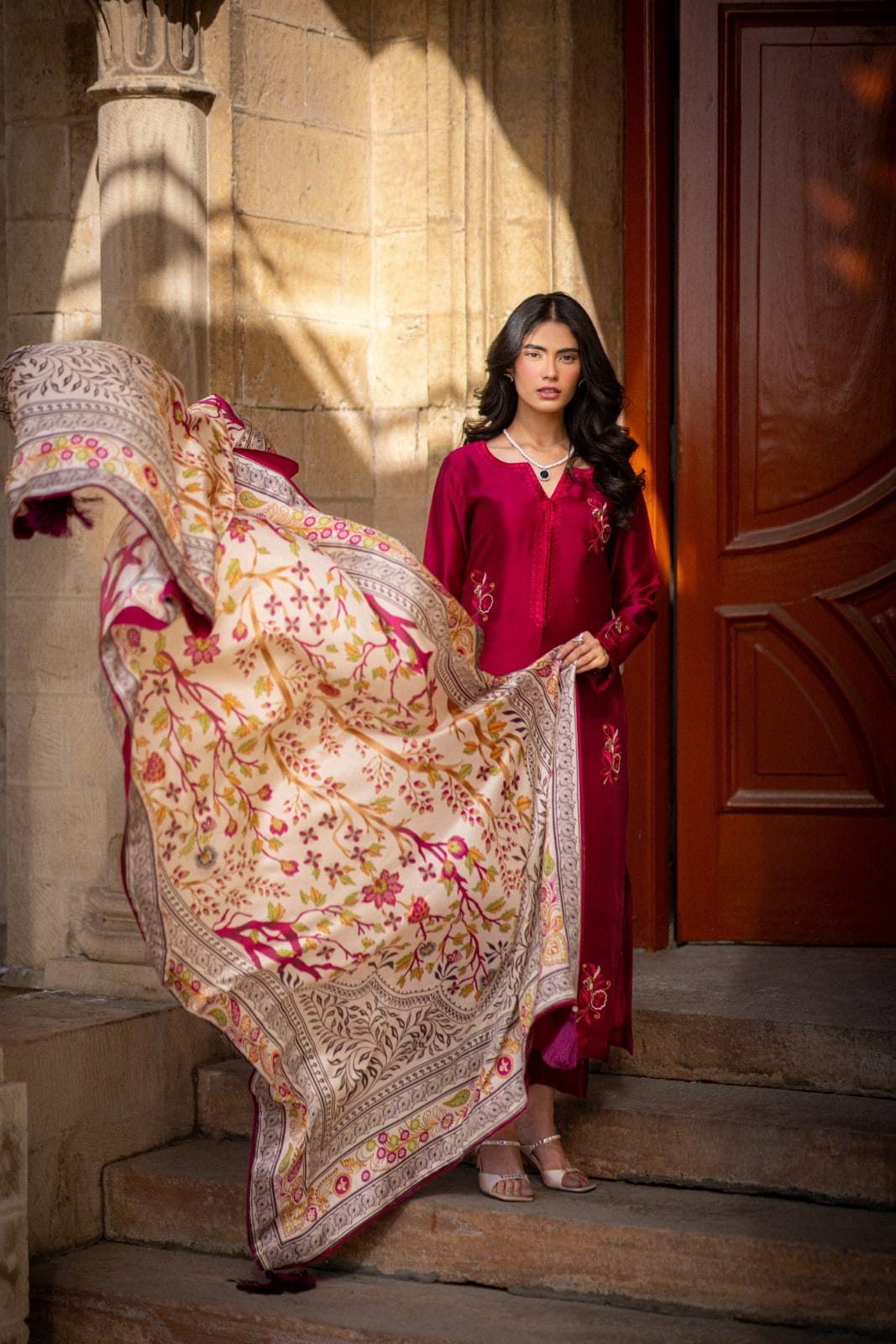The beauty of this stunning ensemble lies in its pure medium silk digitally custom-printed dupatta, artfully enhanced with delicate tussles for an added touch of sophistication. The look is complemented by a pure glass silk shirt and trouser, each intricately crafted with embroidery all over, showcasing exceptional craftsmanship. This outfit seamlessly blends modern print with classic embroidery, creating a perfect balance of elegance and contemporary charm—ideal for any special occasion.