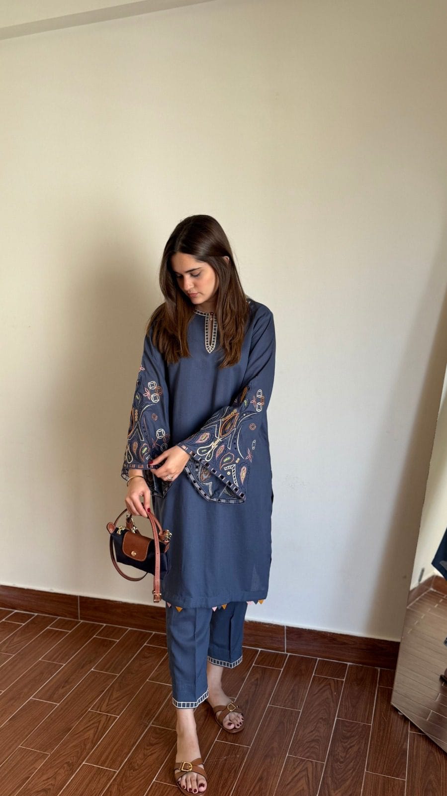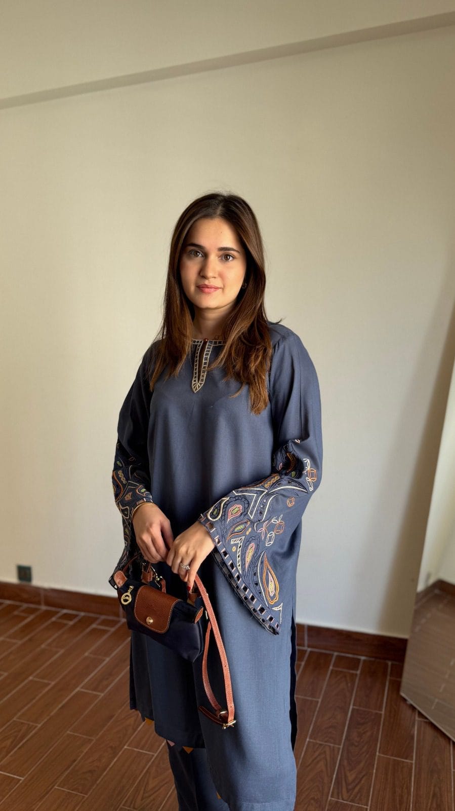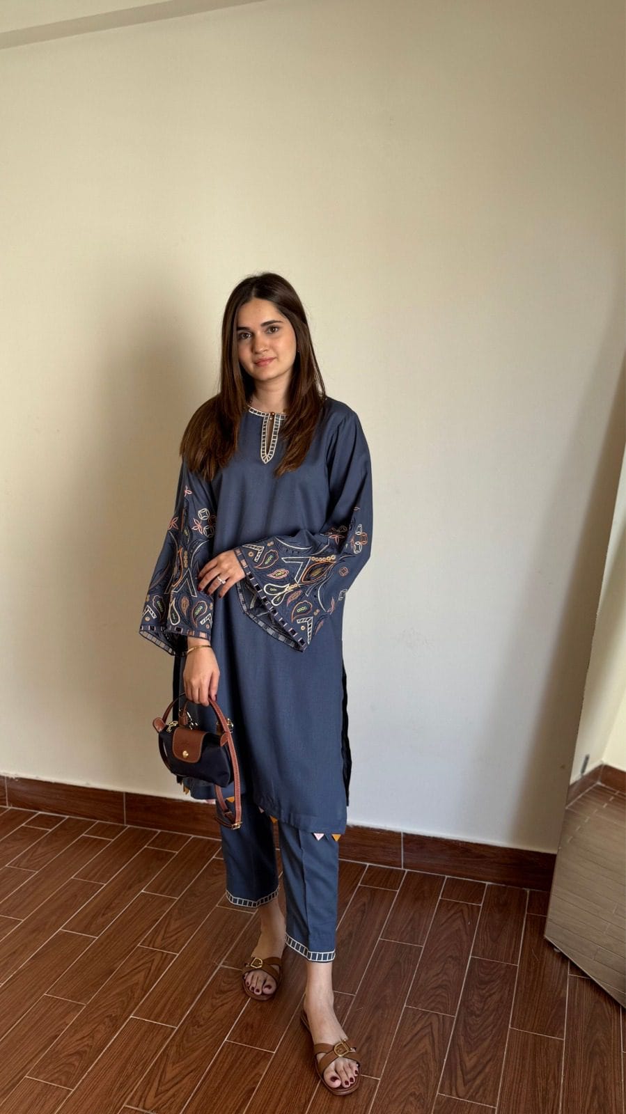 ! A deep blue-grey color paired with delicate cutwork embroidery on the bell sleeves and trousers would create an elegant and stylish loo