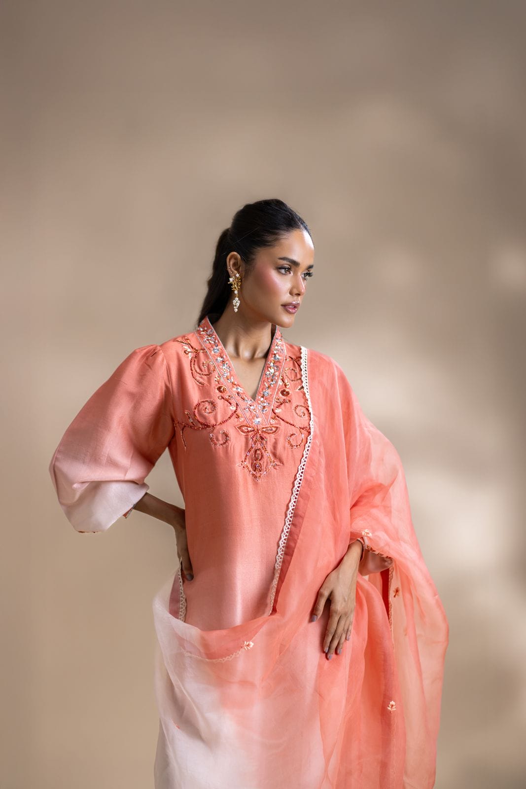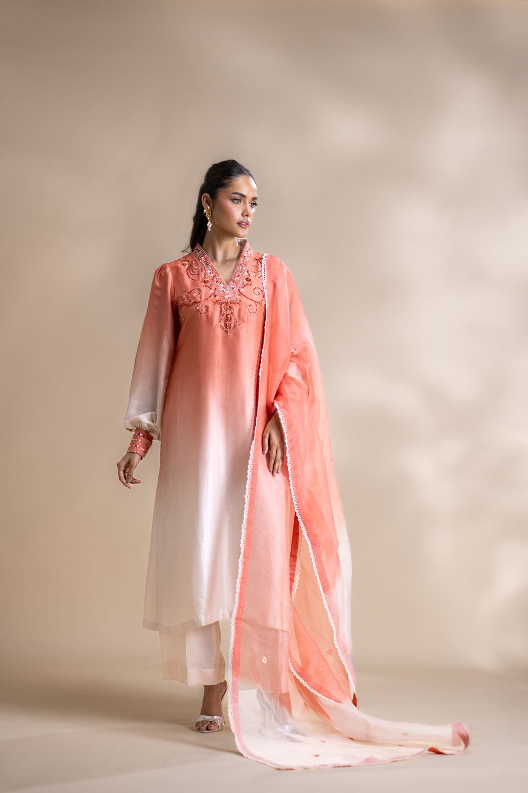 The peach-gold ombré is your next style statement. With exquisite handwork, chic balloon sleeves, and a sleek contemporary fit, this look is all about effortless elegance and modern flair.