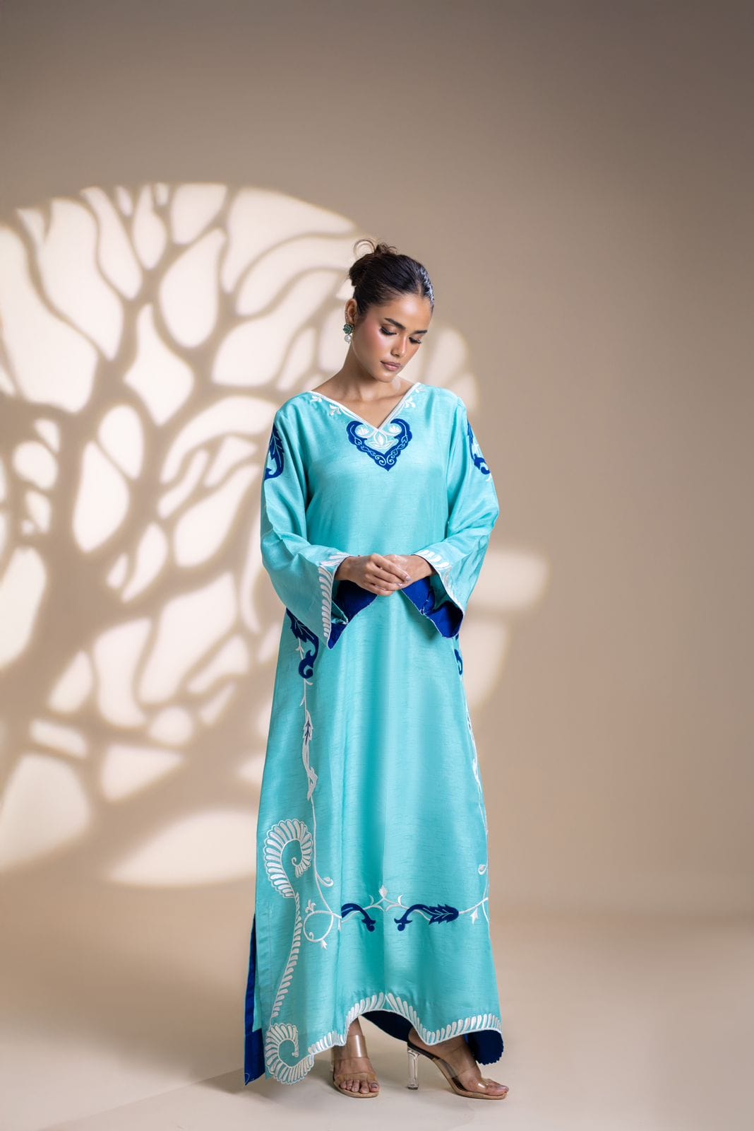 Elevate your style with this stunning aqua blue kaftan, crafted from luxurious Korean silk. Featuring intricate embroidery all over,