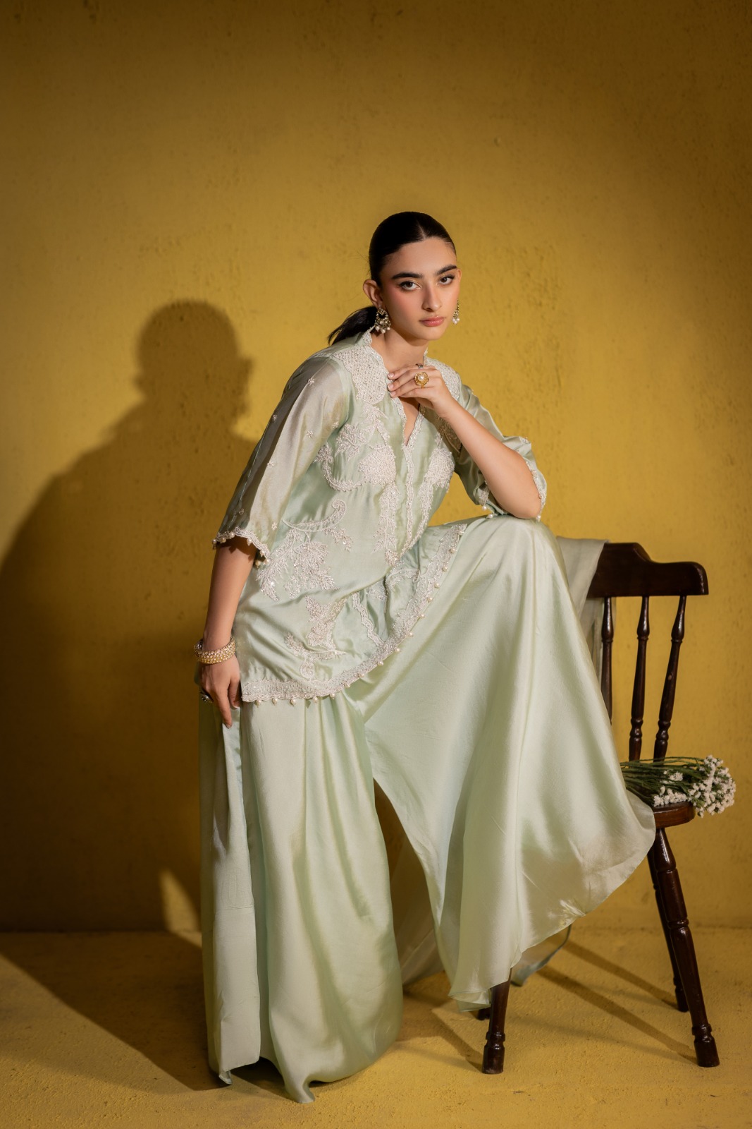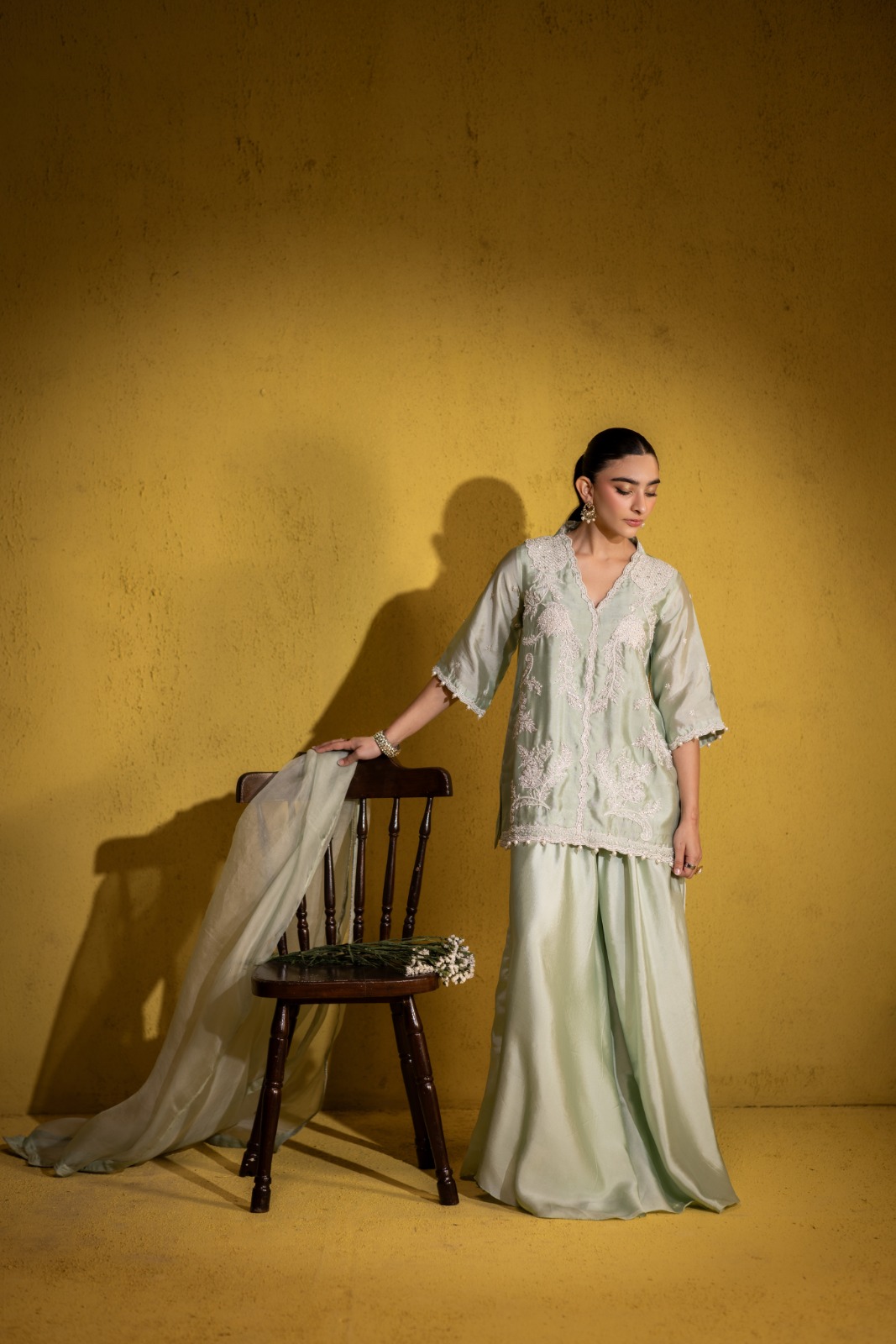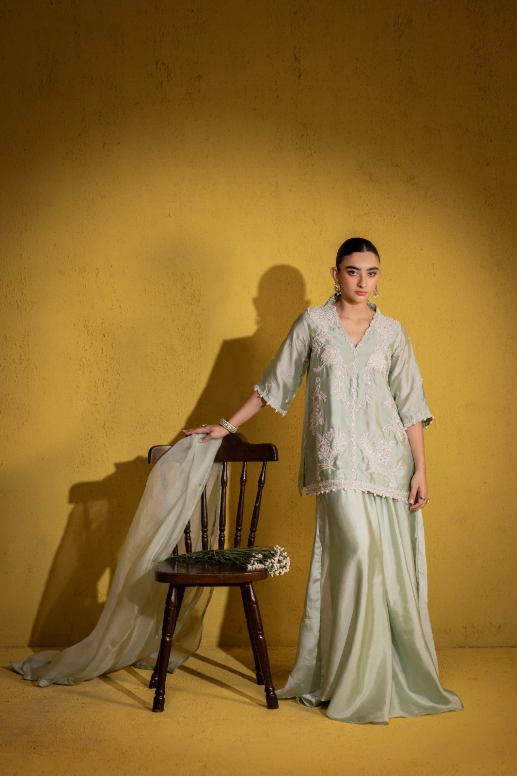 Shirt: Pure Glass Silk Bottom: Pure Glass Silk Dupatta: Organza (can b customize in any other material like silk or chiffon)
