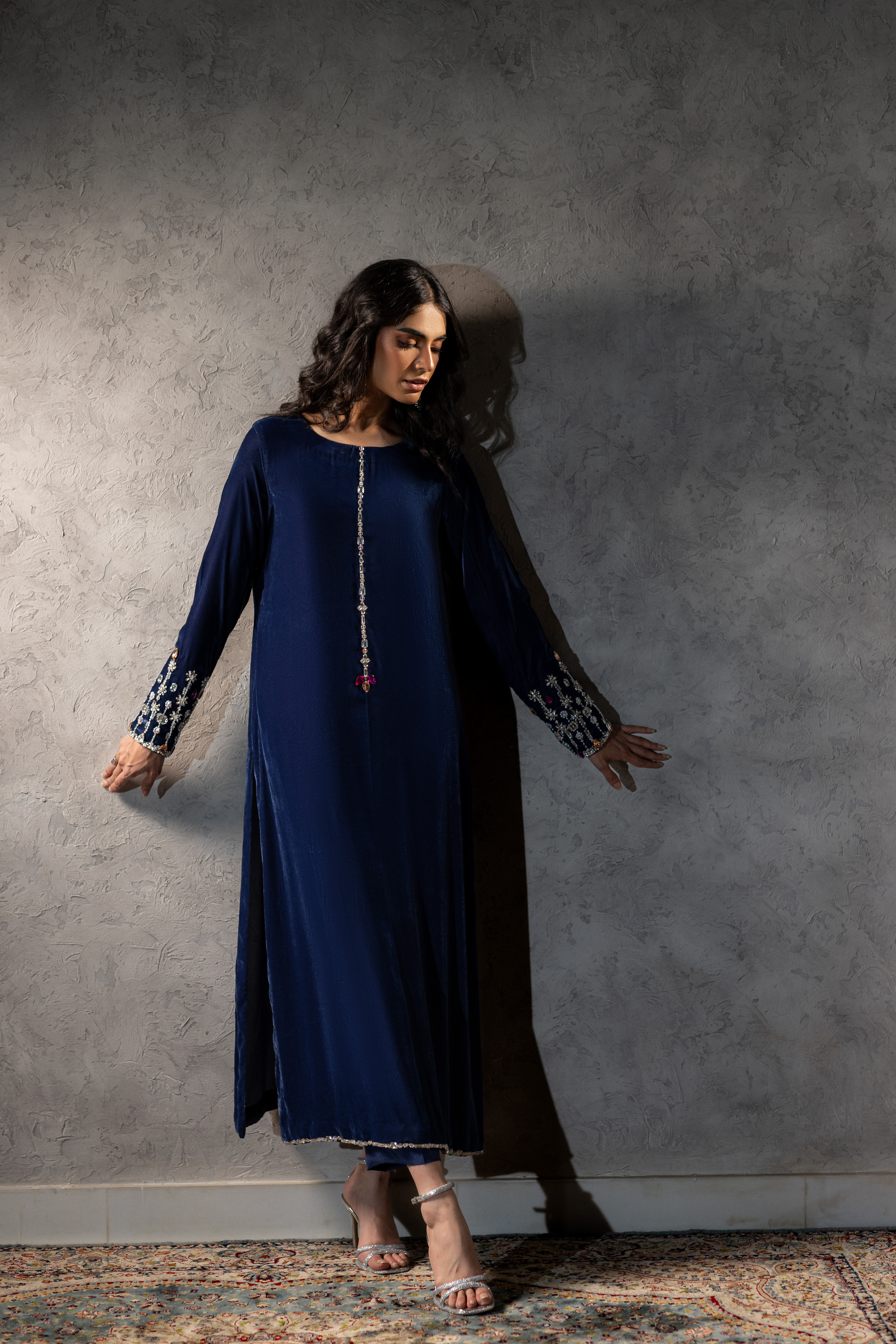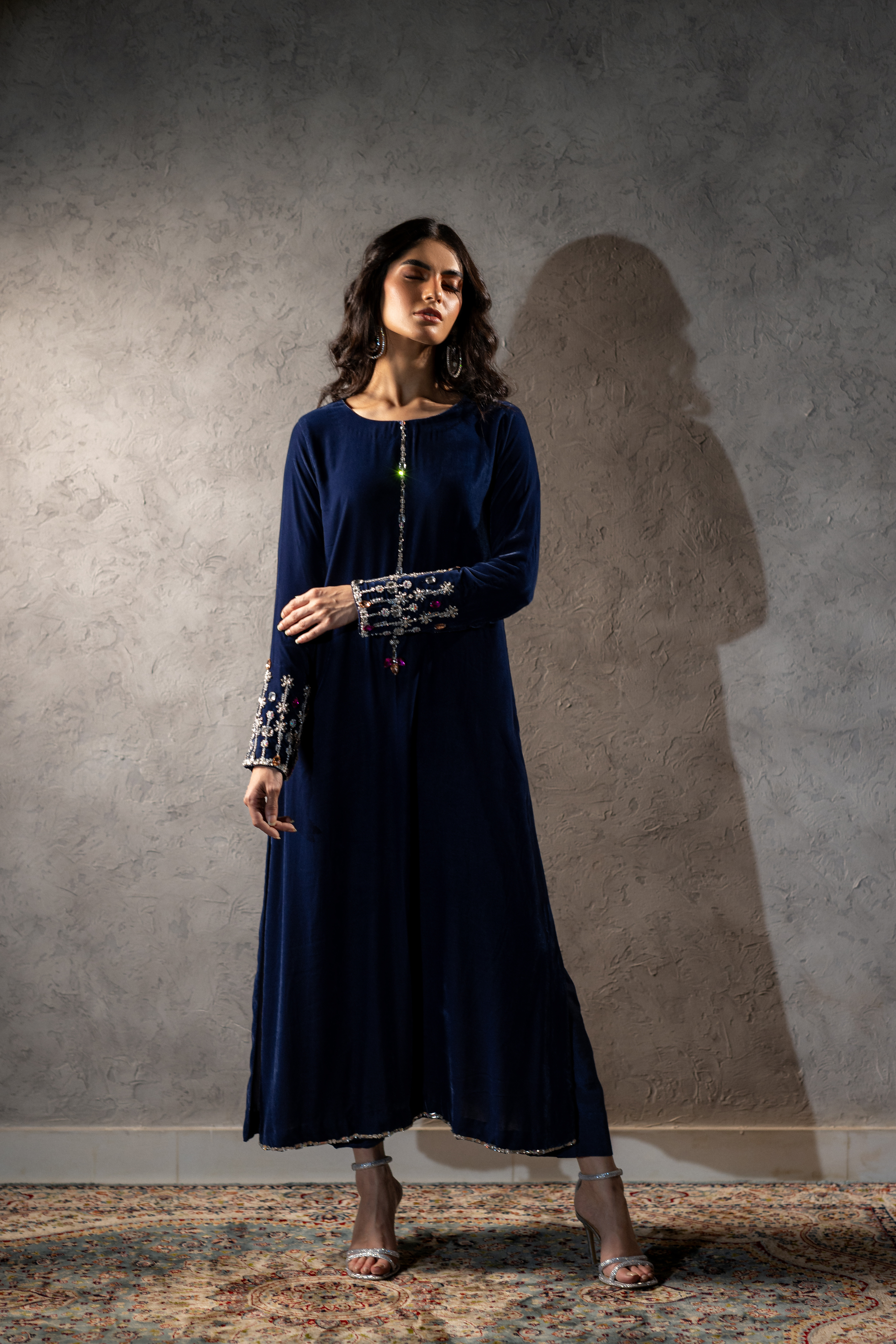 A beautiful deep blue French velvet article adorned with delicate stone work. Its rich hue and luxurious texture make it a statement piece — perfect for elegant winter evenings and festive celebrations.