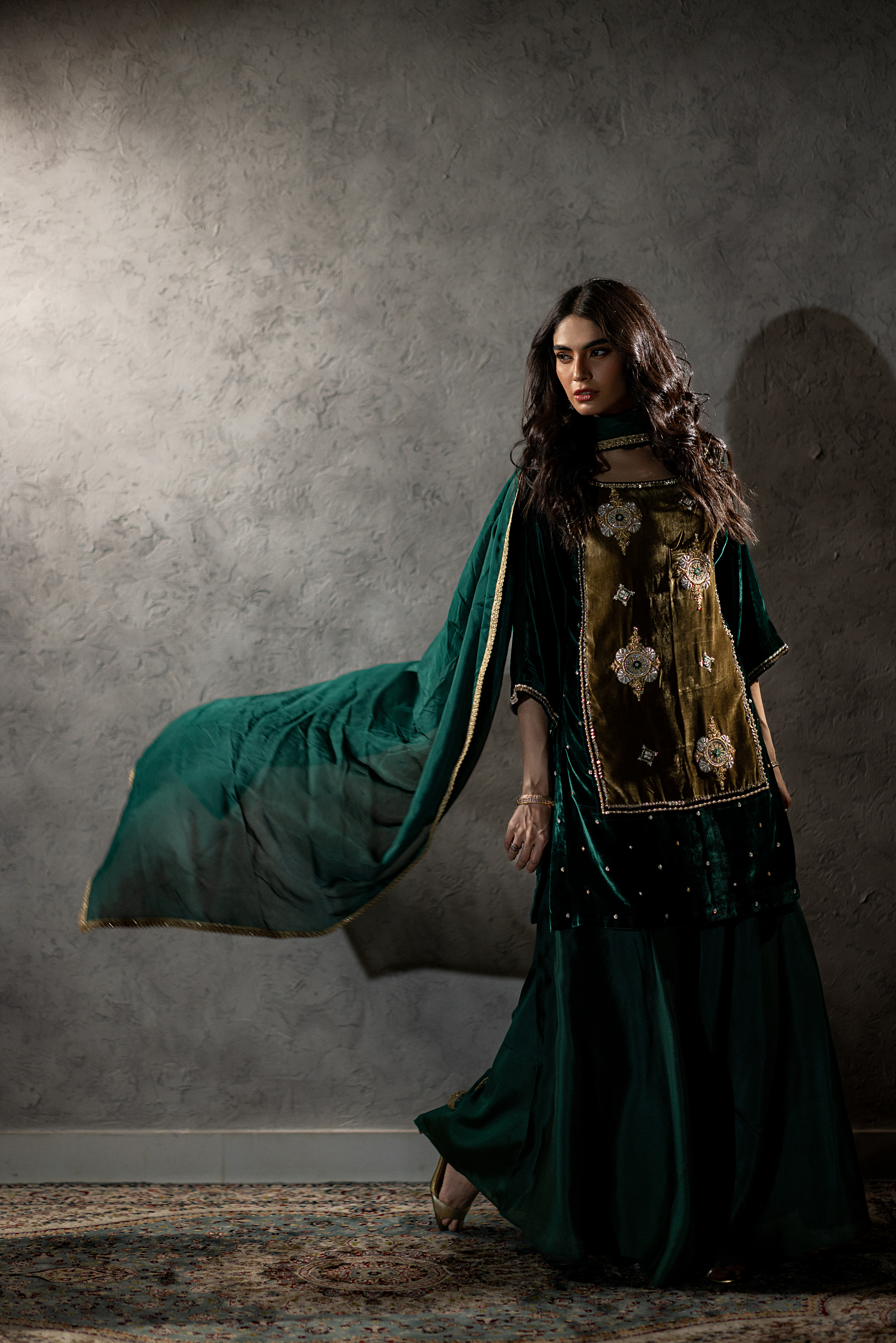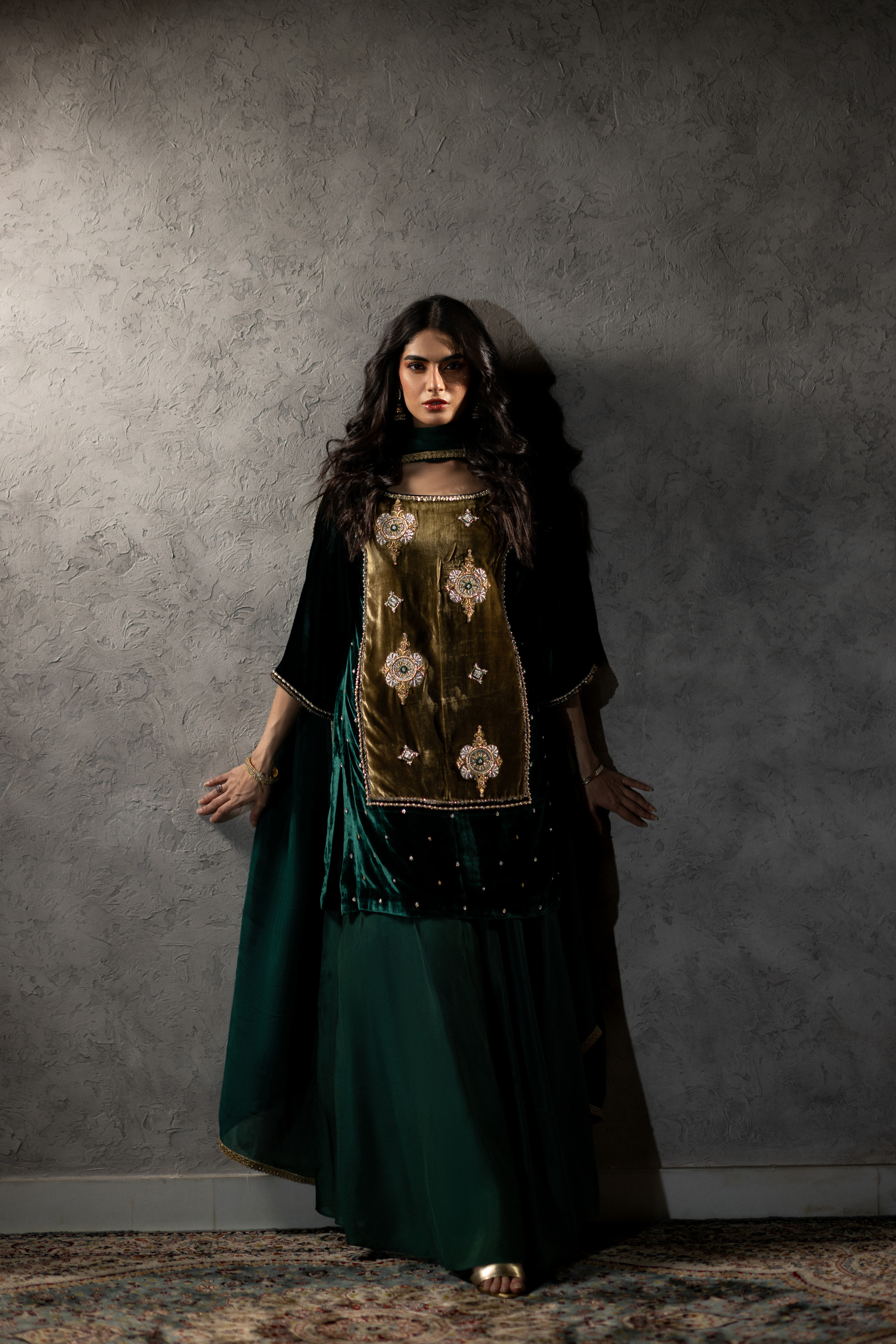 A stunning blend of gold and deep green hues, adorned with intricate zardozi handwork and elegant patchwork. Paired with a silk Dhaka pajama and a matching silk dupatta, this ensemble exudes timeless grace and regal sophistication perfect for festive and formal occasions.