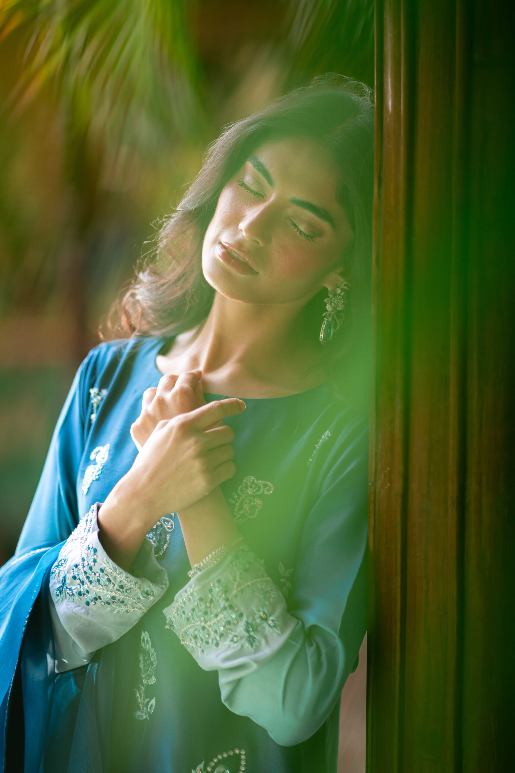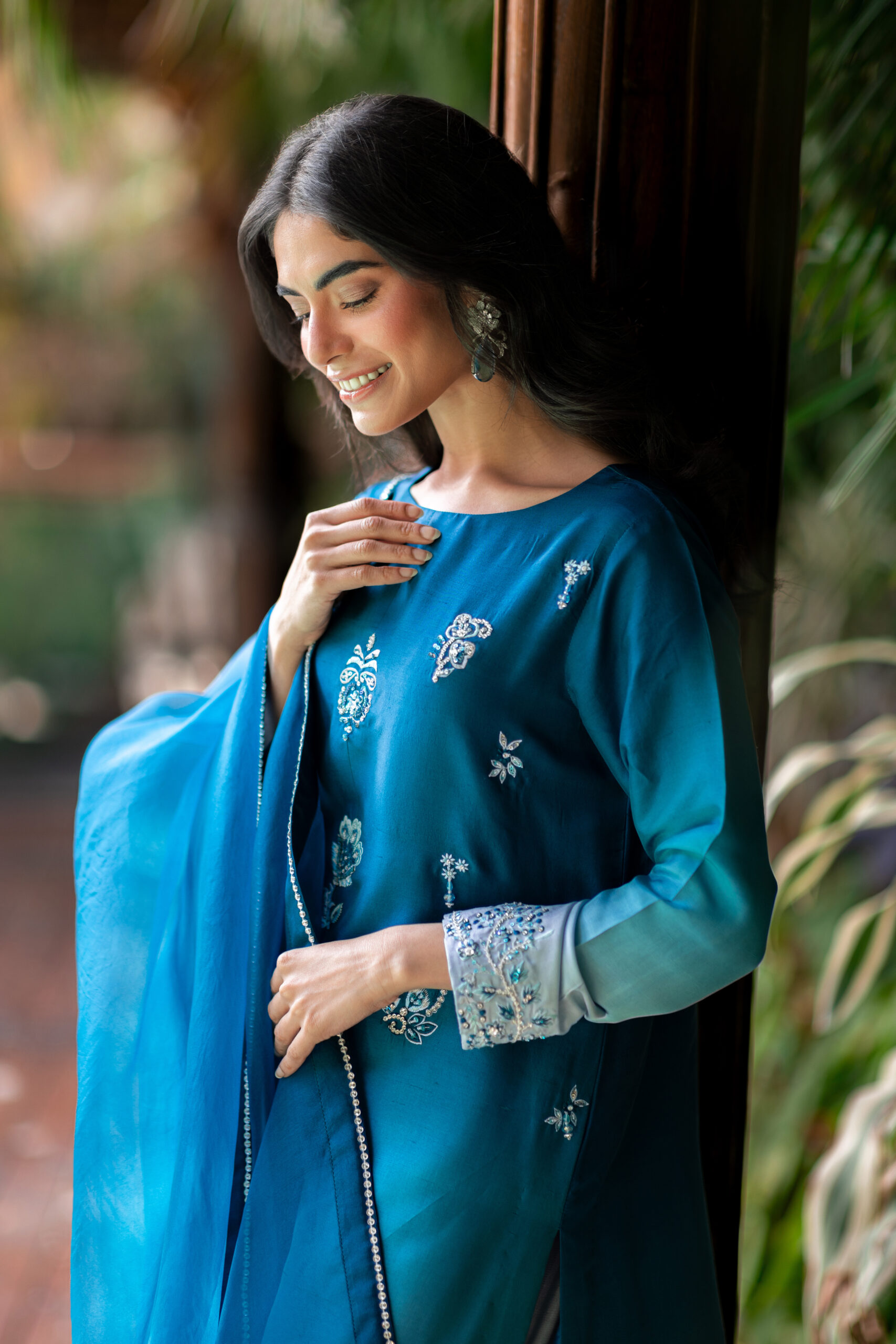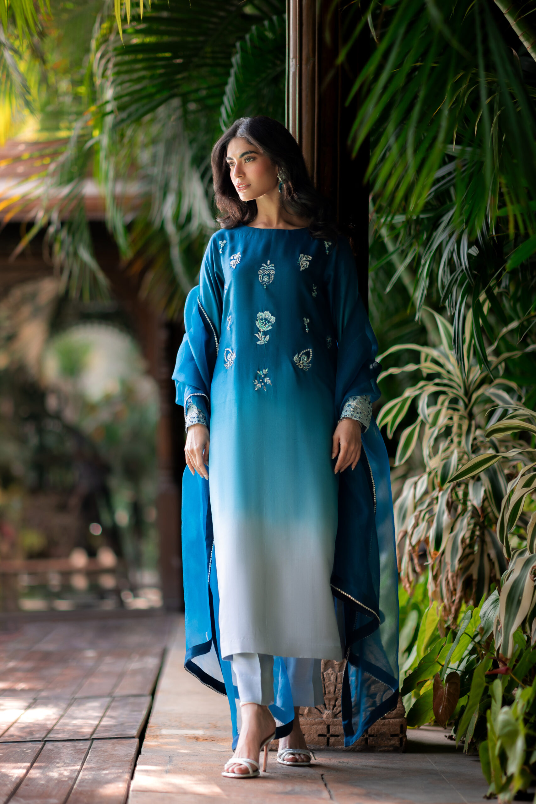 The blue ombré hues on pure raw silk, enhanced with intricate embroidery and hand embellishment, create a truly stunning look