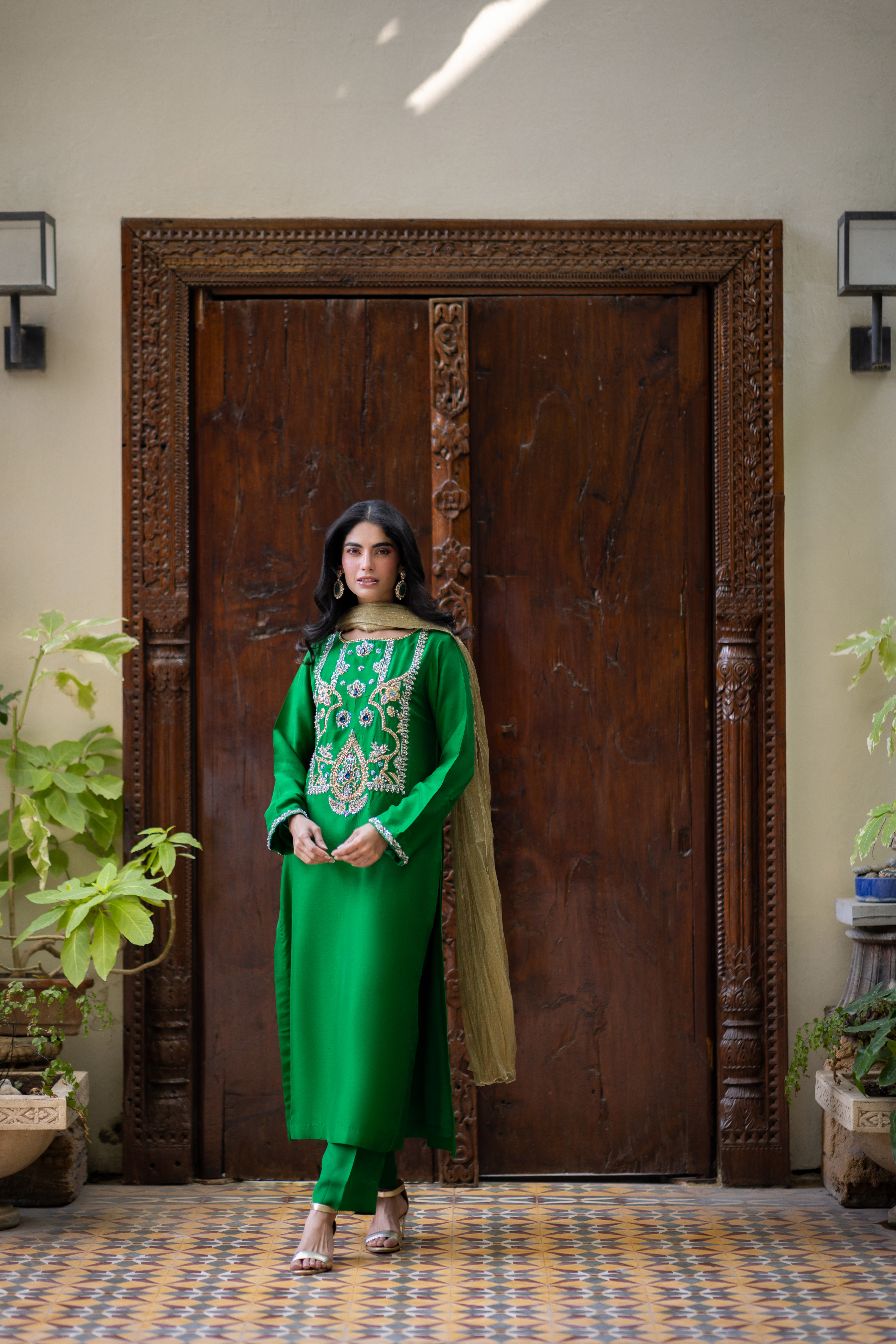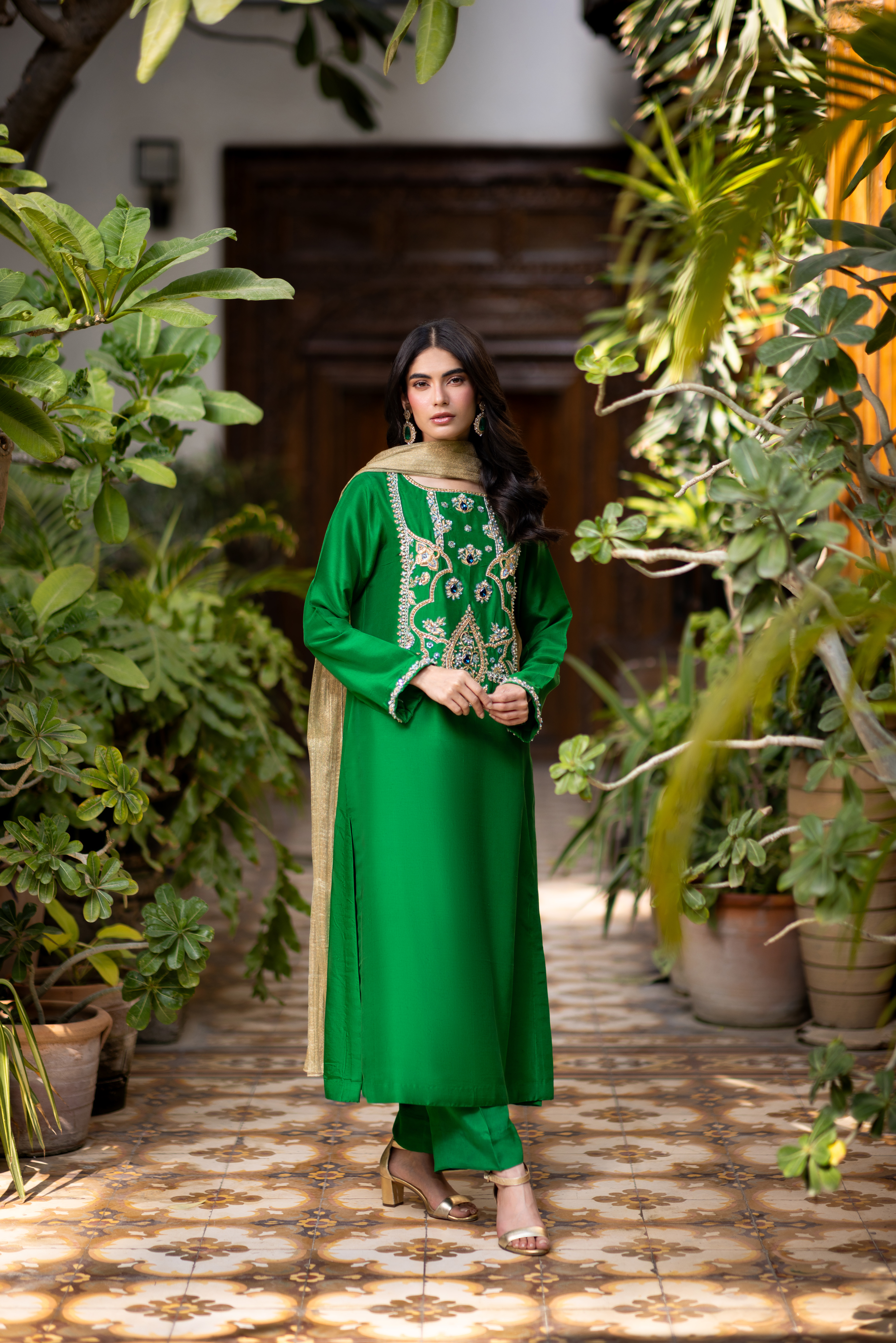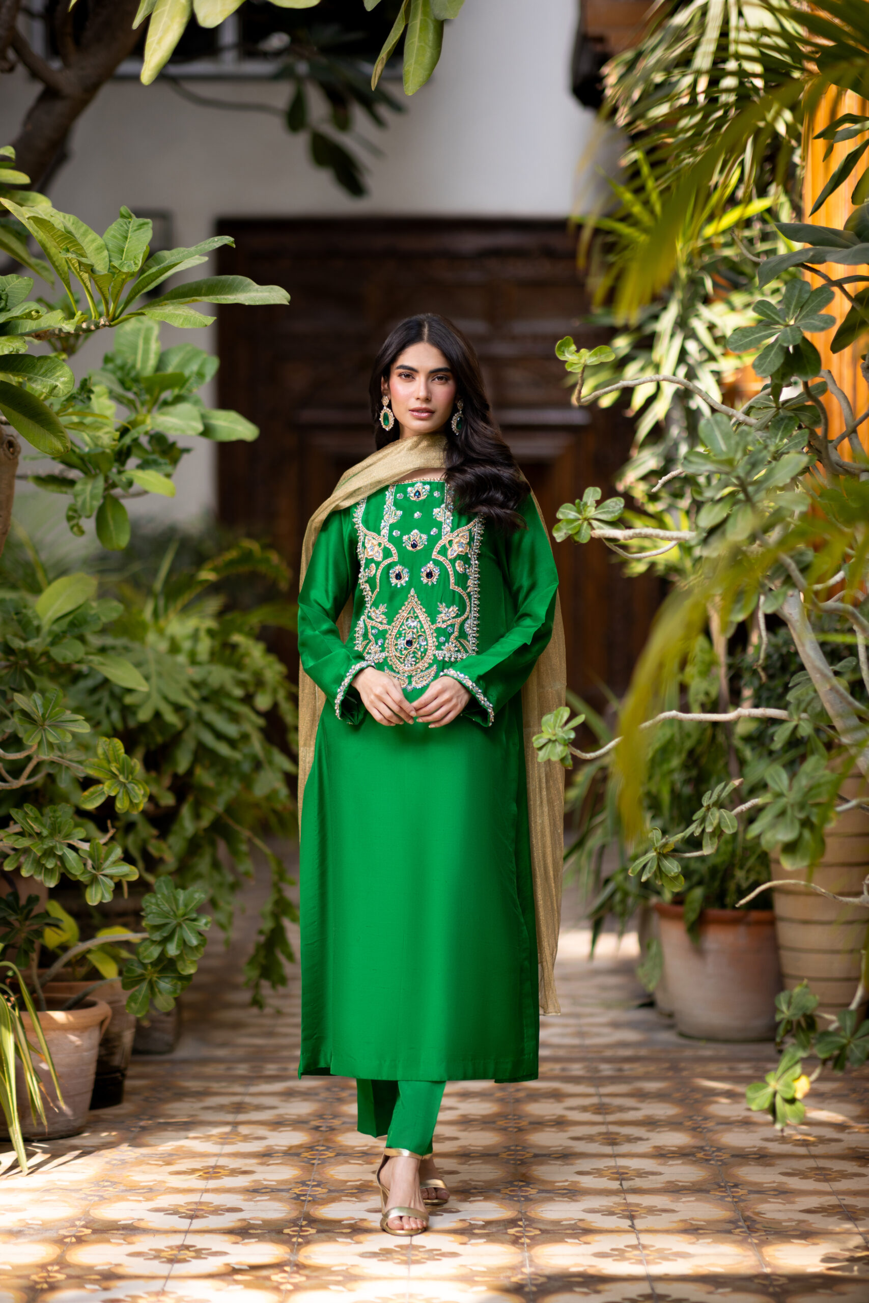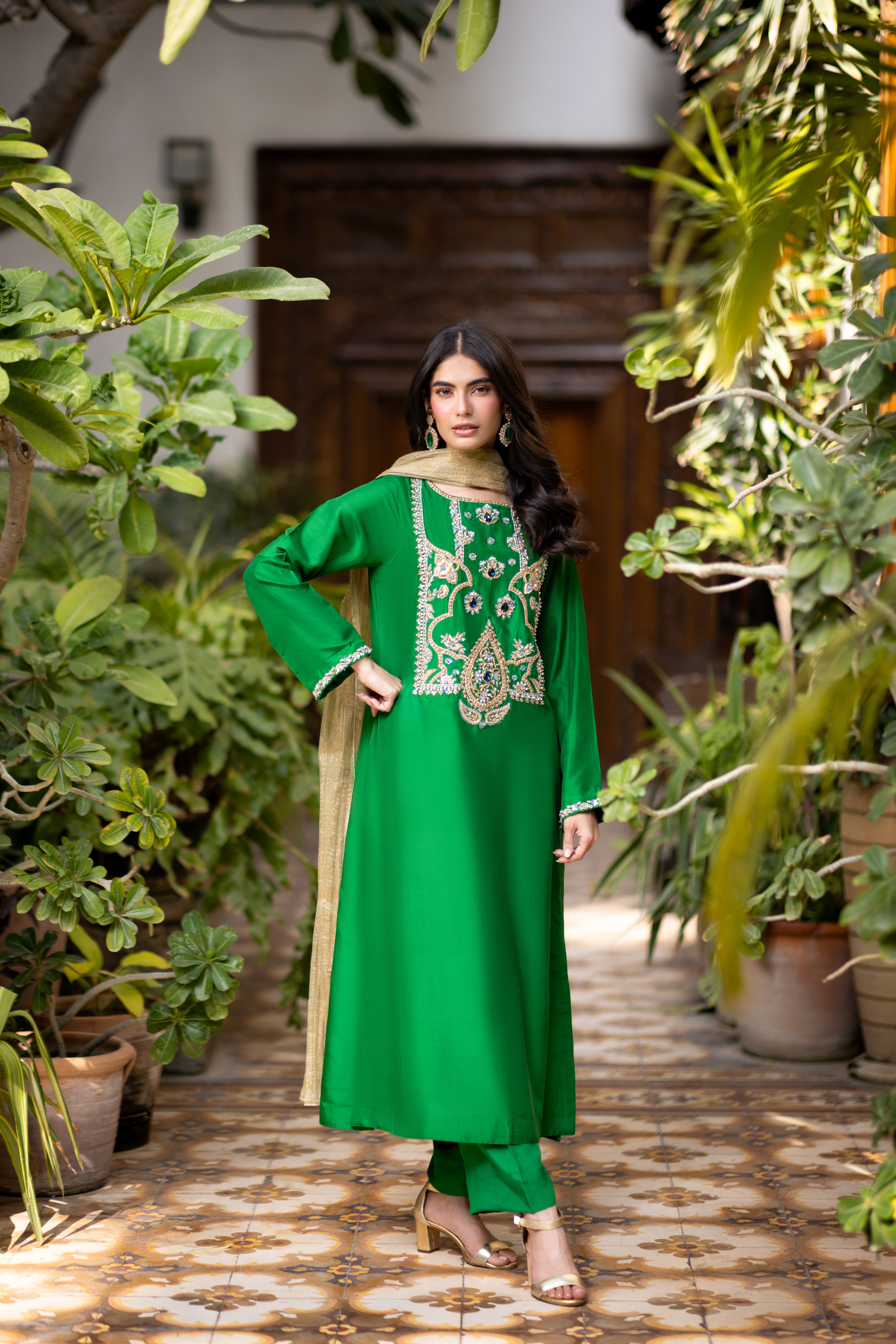 Crafted on a rich green raw silk base, this silhouette features intricate handworked kora dabka and stone detailing, paired with a gold crushed maysuri dupatta that adds the perfect finishing touch.