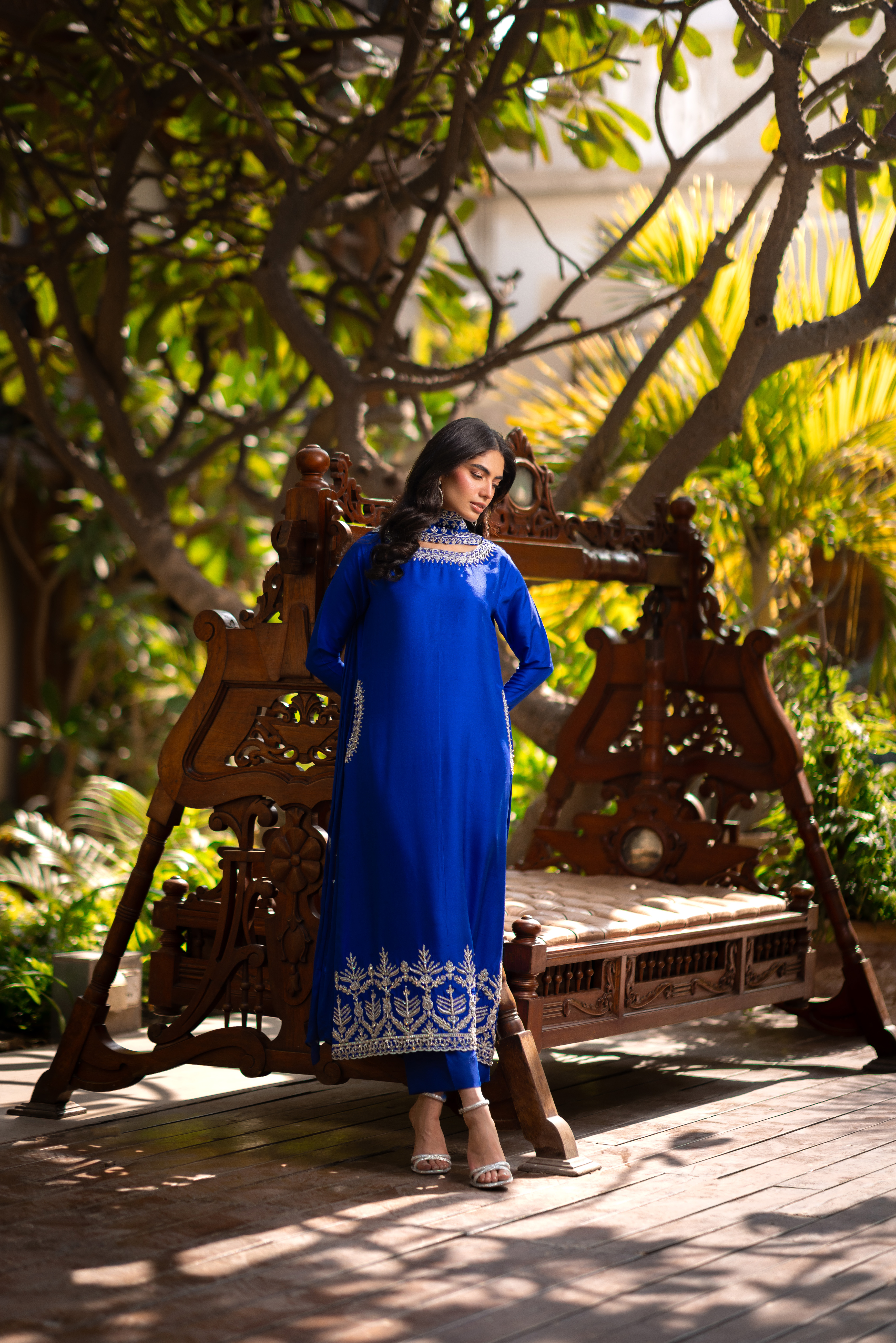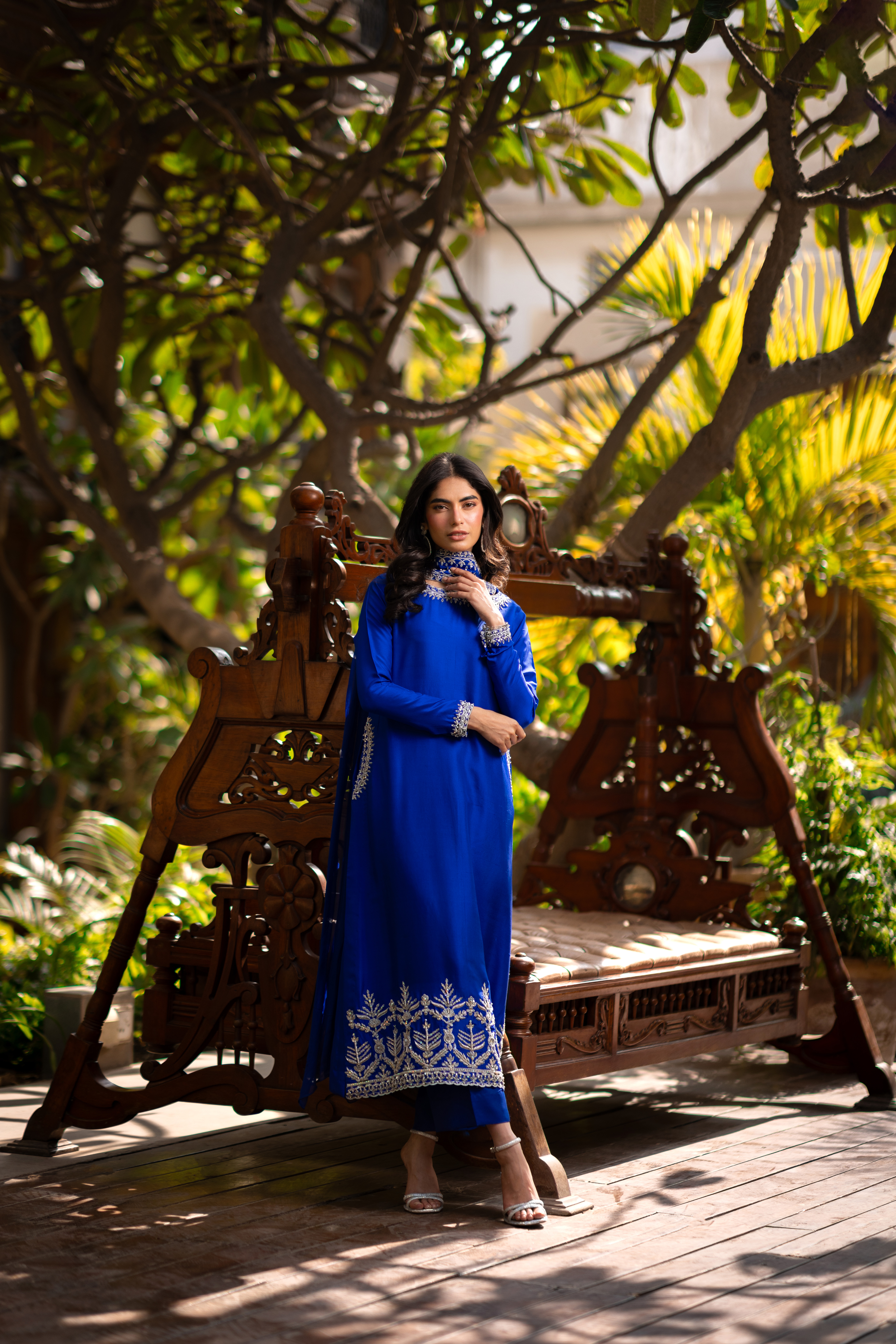 Royal blue raw silk with delicate silver shimmer and fine detailing, paired with a statement dupatta featuring an embellished work patch for a bold yet elegant look.