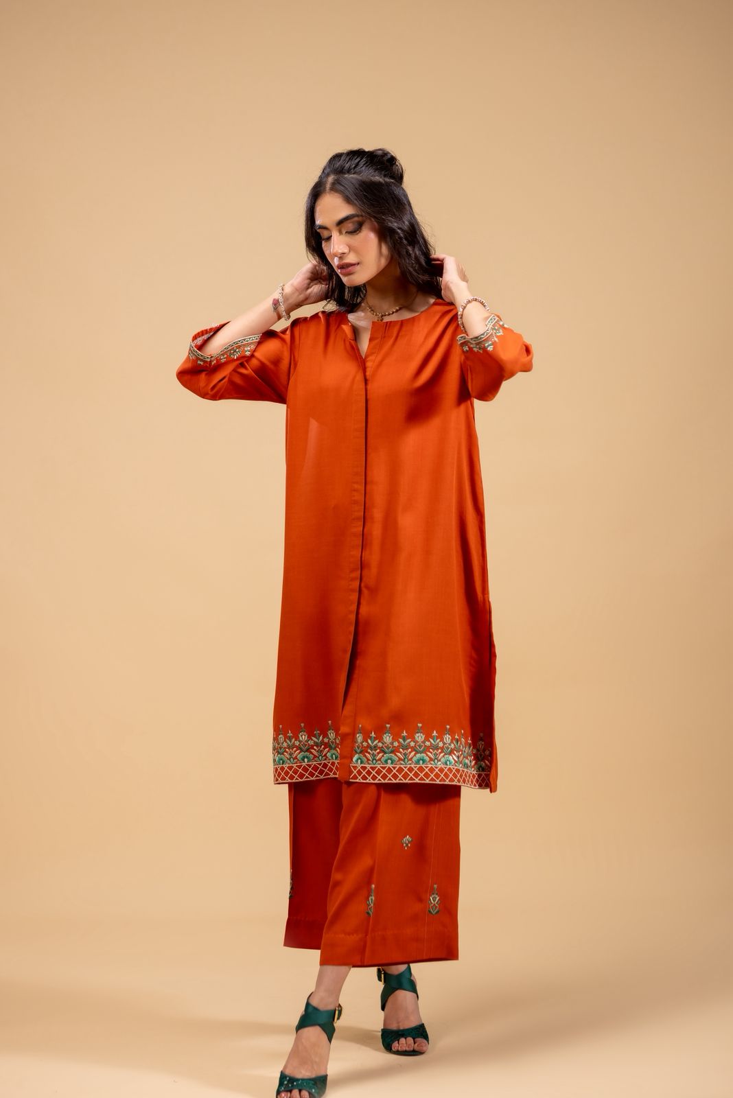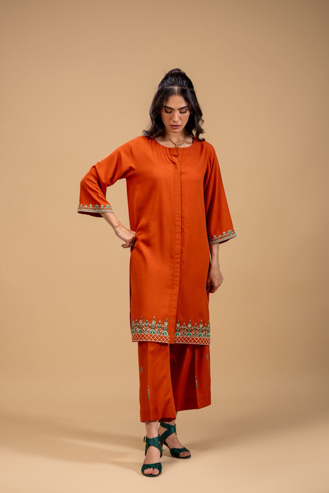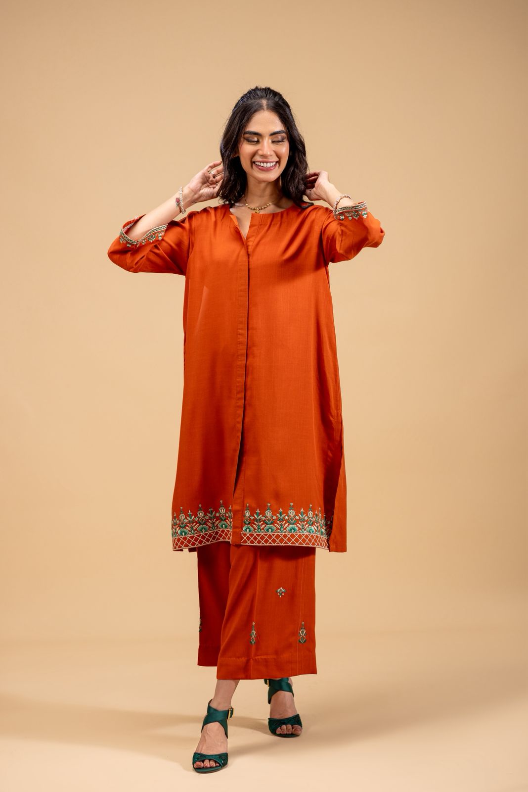 A chic rust-toned casual pret featuring subtle embroidered borders on the kurta and matching straight trousers. Designed in a comfortable, breathable fabric, this effortless ensemble is perfect for everyday wear with a touch of elegance.