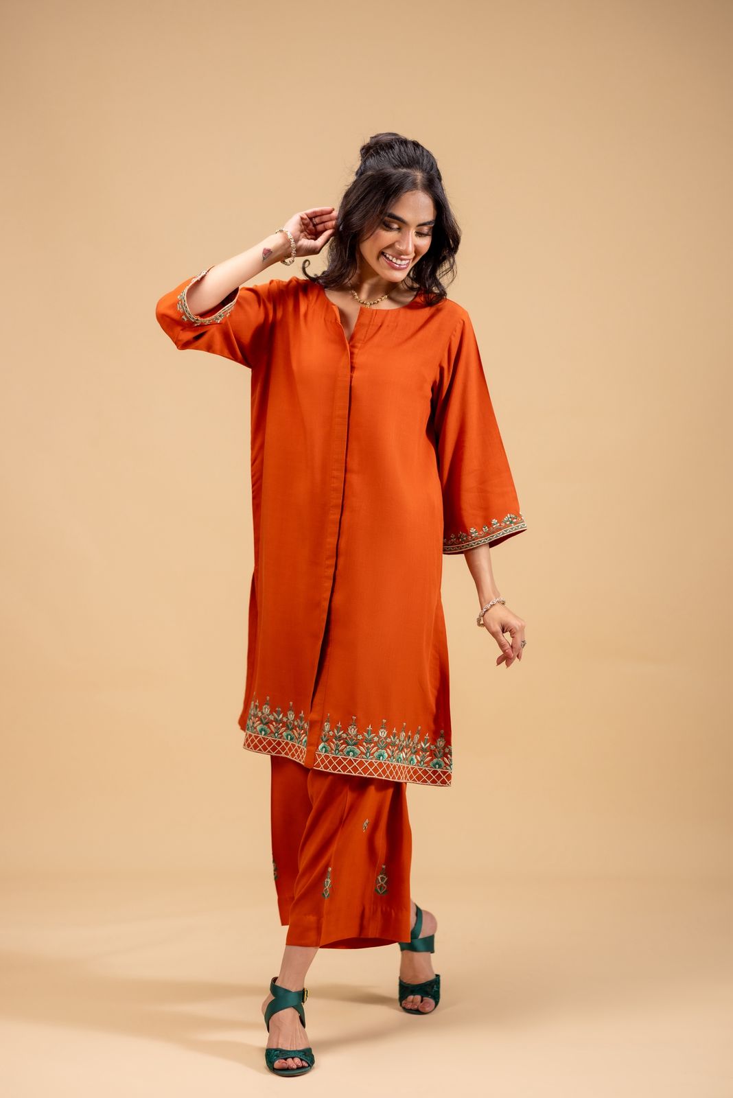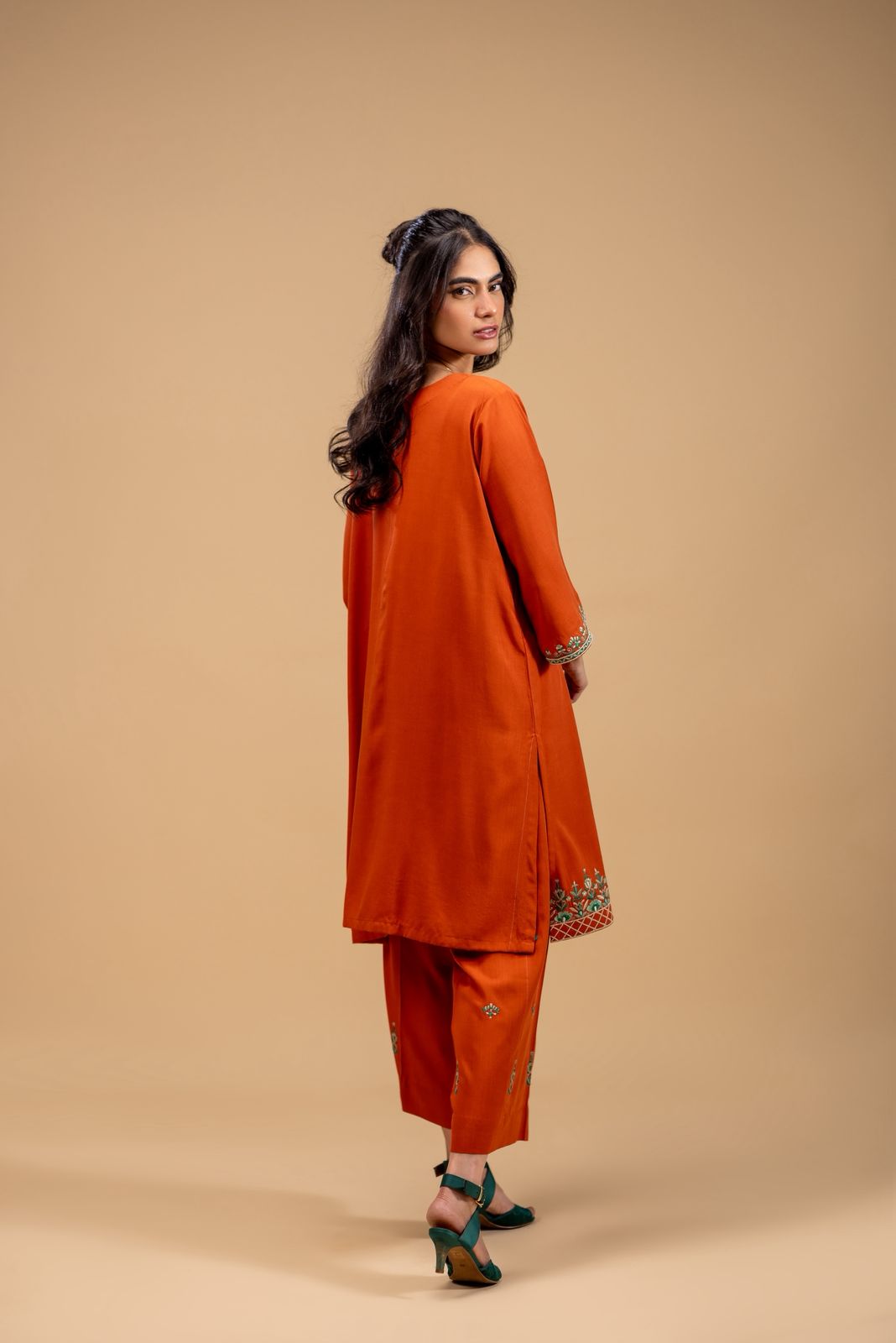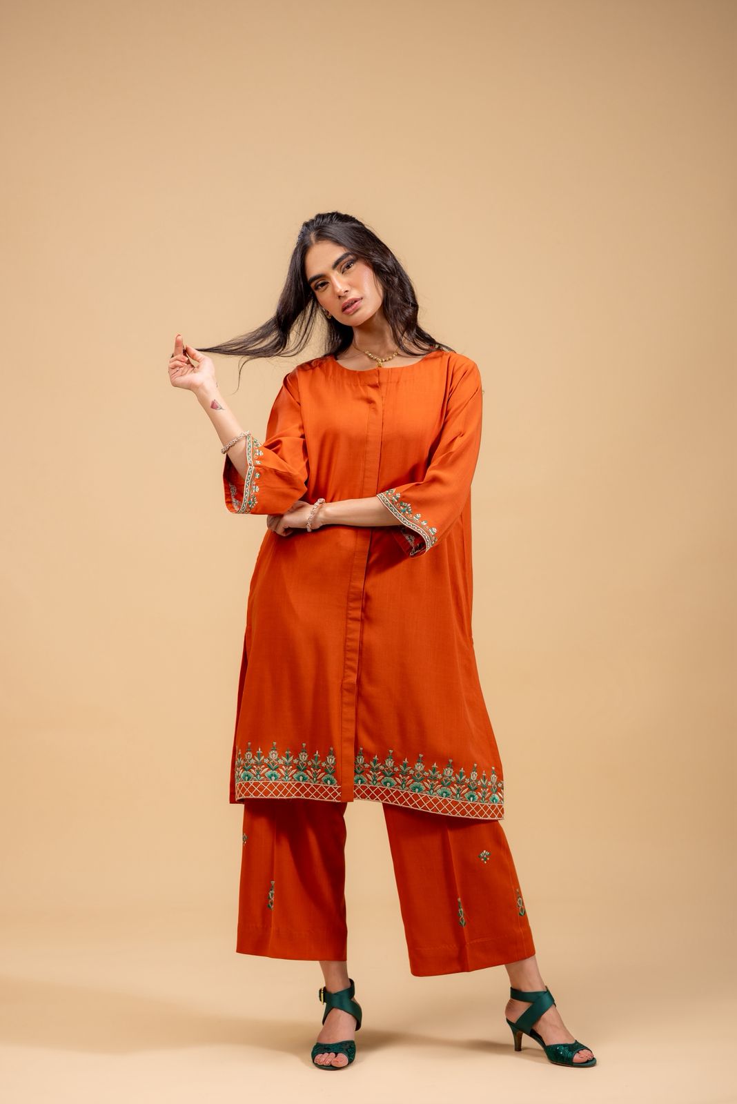 A chic rust-toned casual pret featuring subtle embroidered borders on the kurta and matching straight trousers. Designed in a comfortable, breathable fabric, this effortless ensemble is perfect for everyday wear with a touch of elegance.