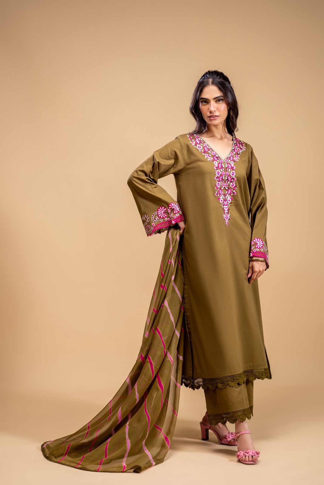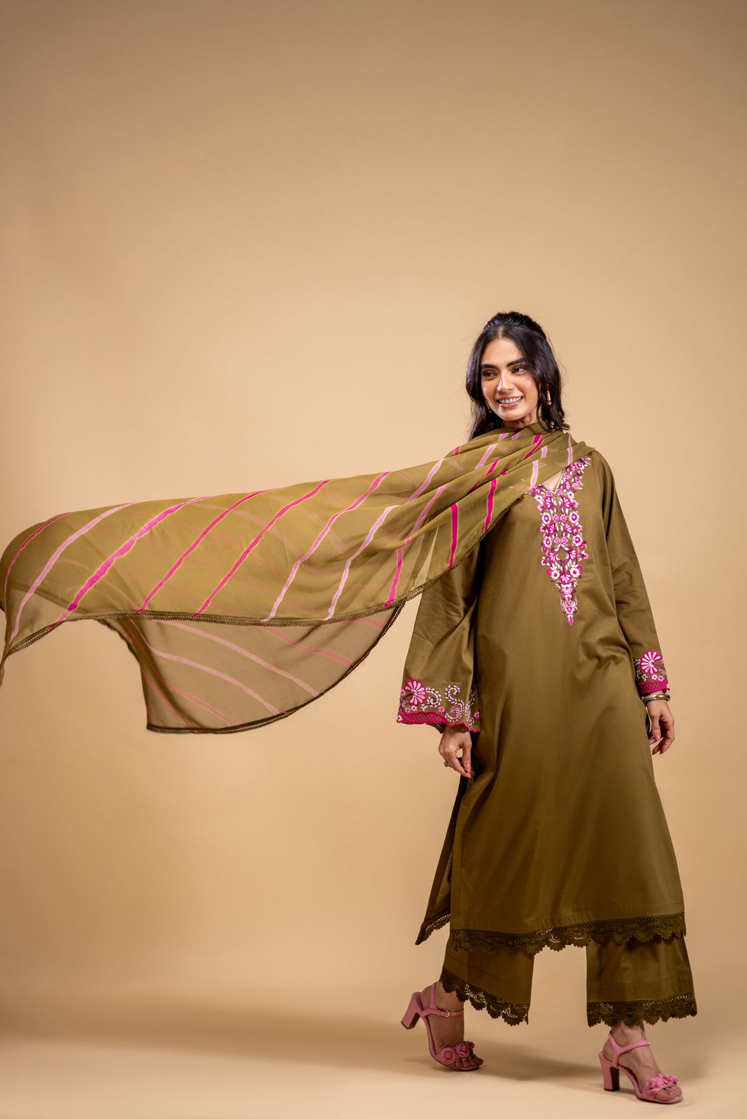 An elegant olive green kurta adorned with intricate pink embroidery on the neckline and sleeves. Paired with matching straight pants finished with delicate lace detailing and a coordinated dupatta with subtle accents, this ensemble offers a graceful blend of comfort and timeless charm.
