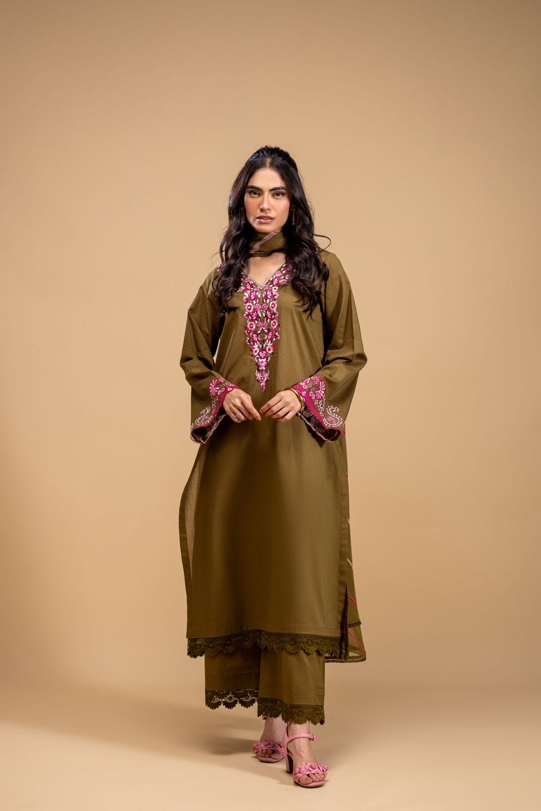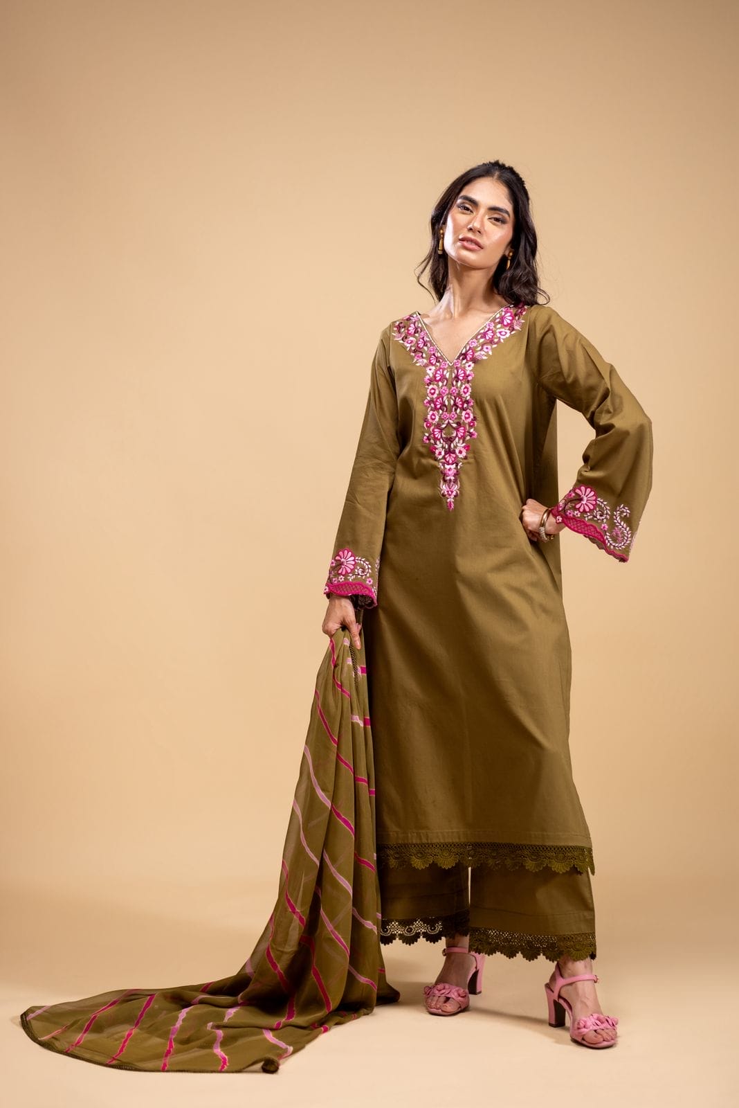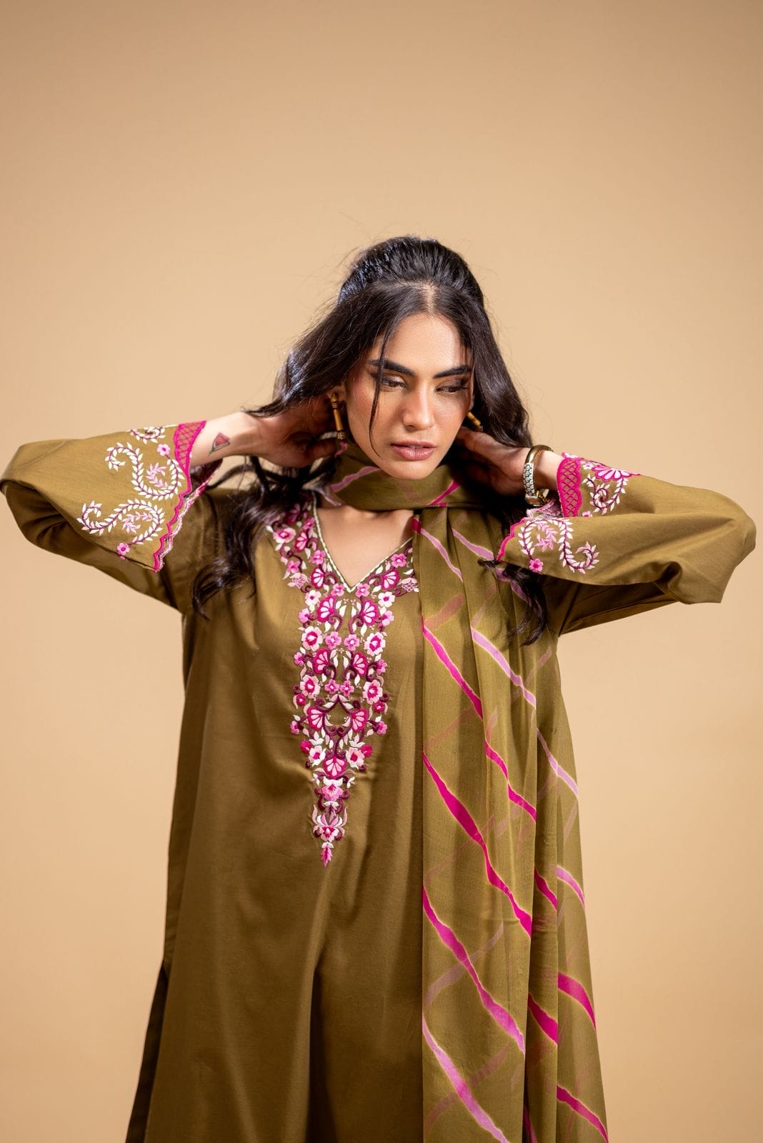 An elegant olive green kurta adorned with intricate pink embroidery on the neckline and sleeves. Paired with matching straight pants finished with delicate lace detailing and a coordinated dupatta with subtle accents, this ensemble offers a graceful blend of comfort and timeless charm.