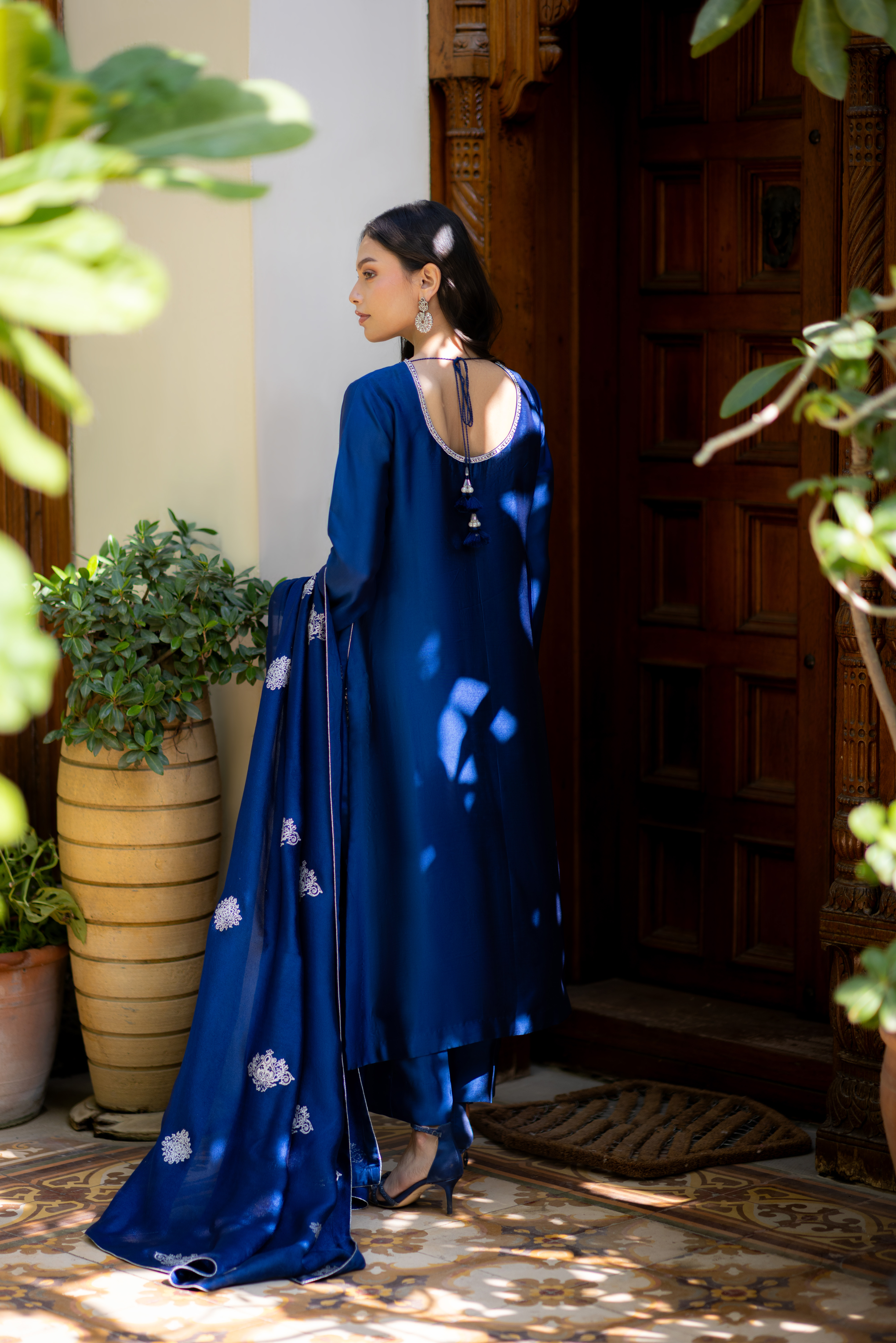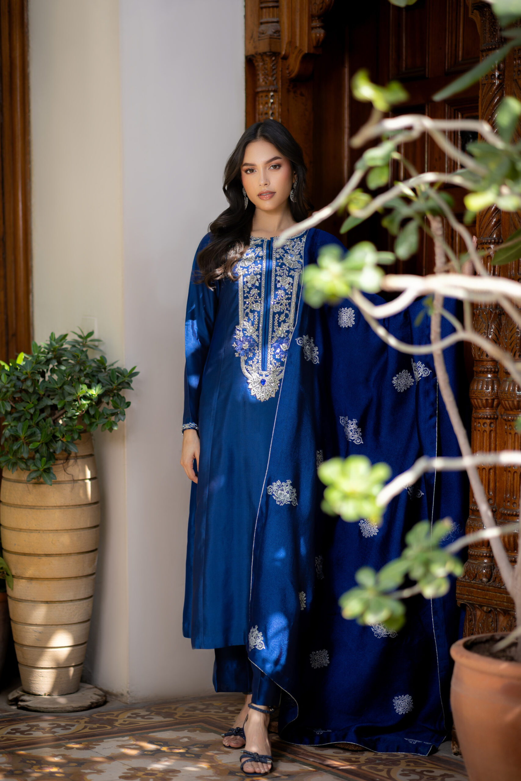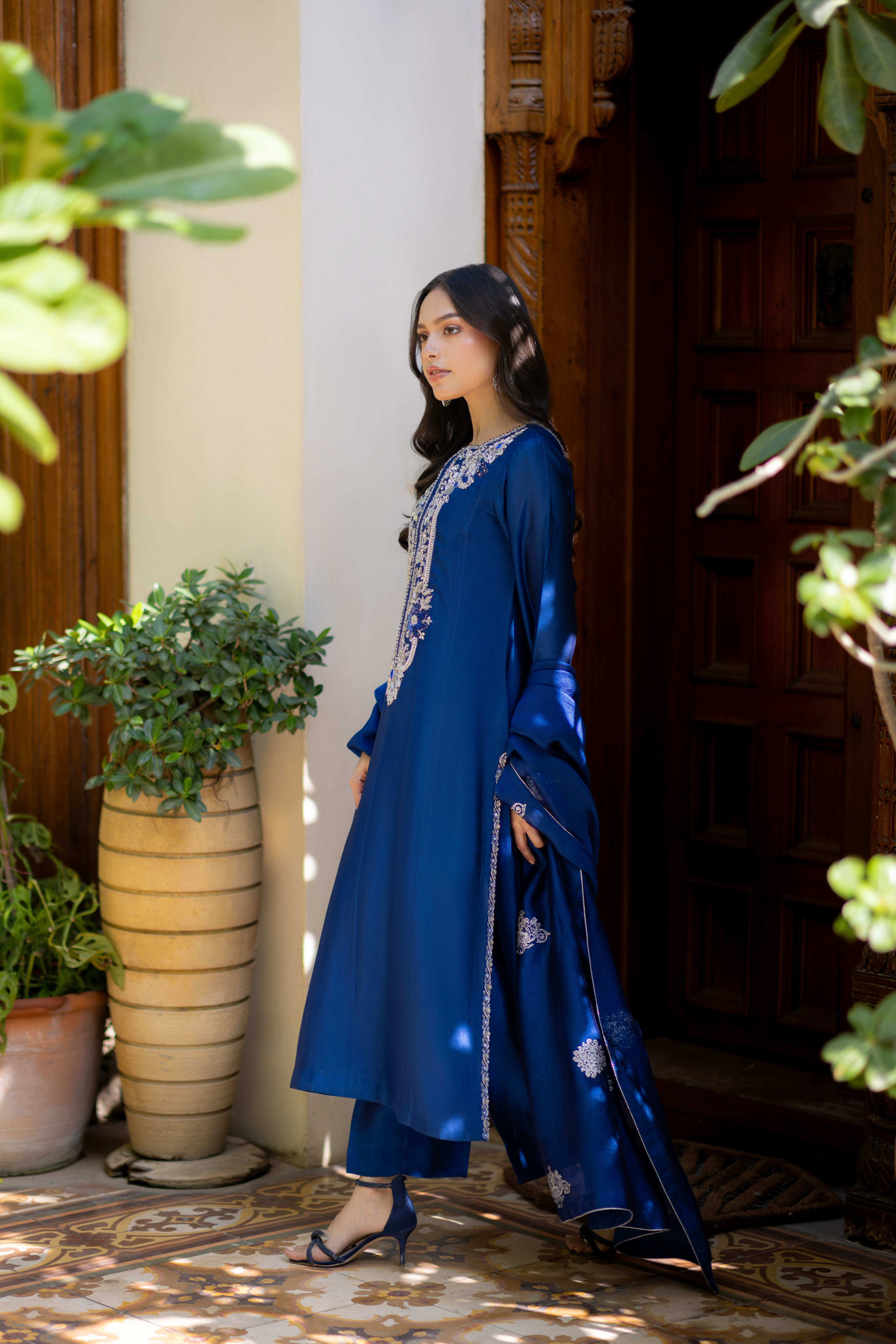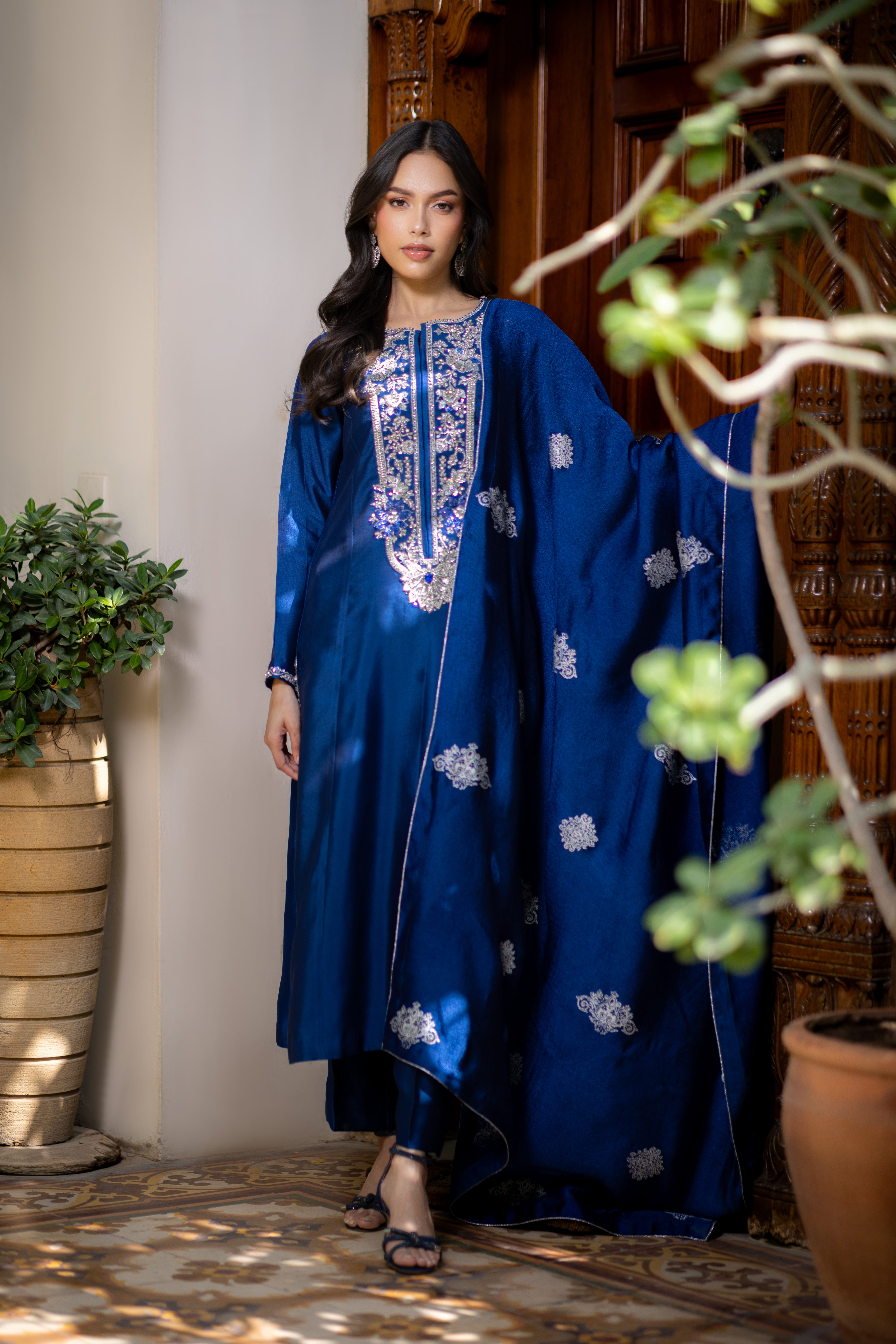 Enchanting hues of blue on pure glass silk, highlighted by a long neckline intricately adorned with kora, dabka, and tikki stones, creating a refined, luminous shimmer. Finished with a silk block-printed dupatta, this couture ensemble embodies elegance and timeless luxury.