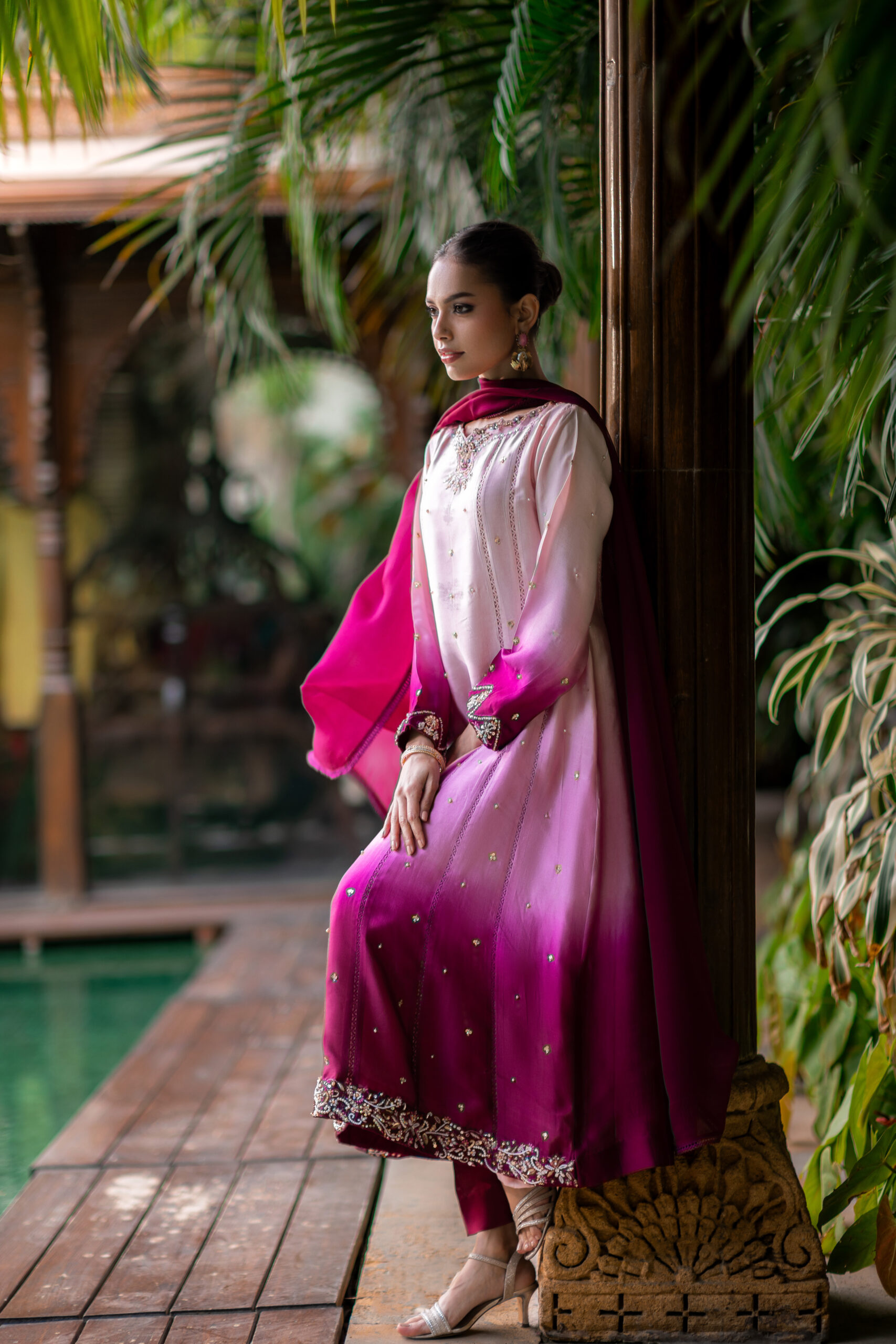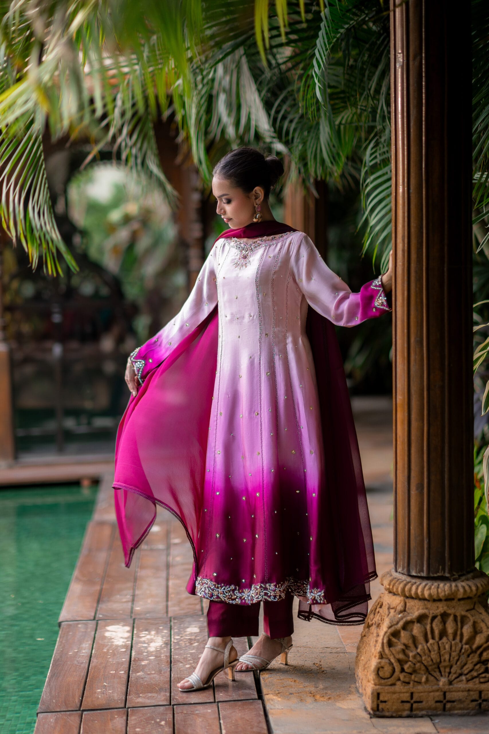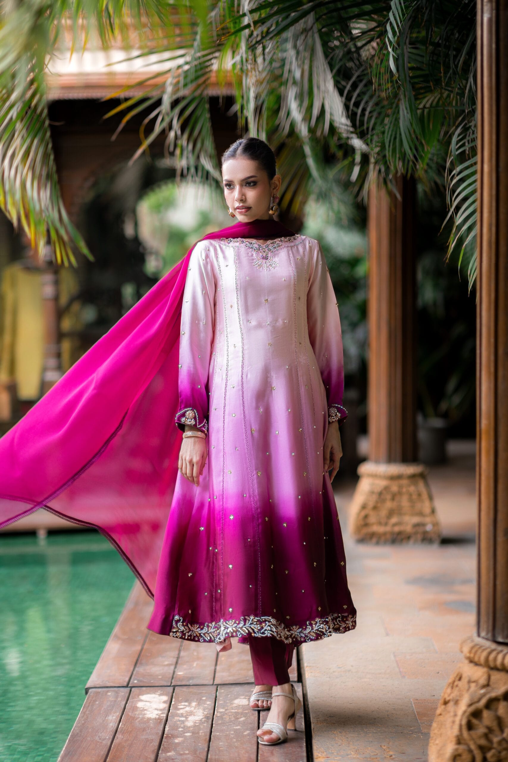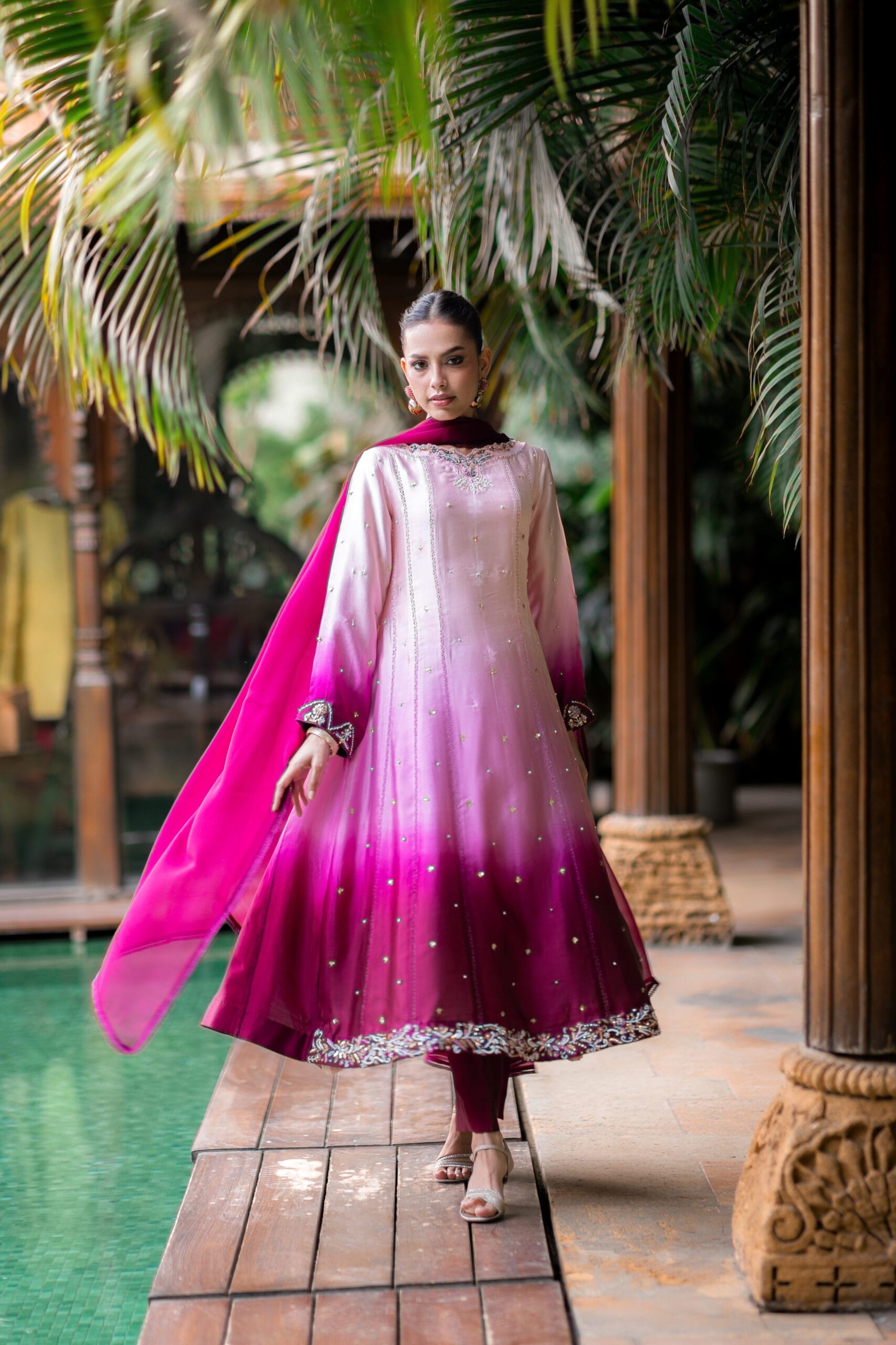The hues of pink and magenta ombré long kalidar, a signature style for festive wear, is beautifully adorned with intricate handwork all over. Its elegant detailing makes it a perfect choice to be styled for any festive celebration.