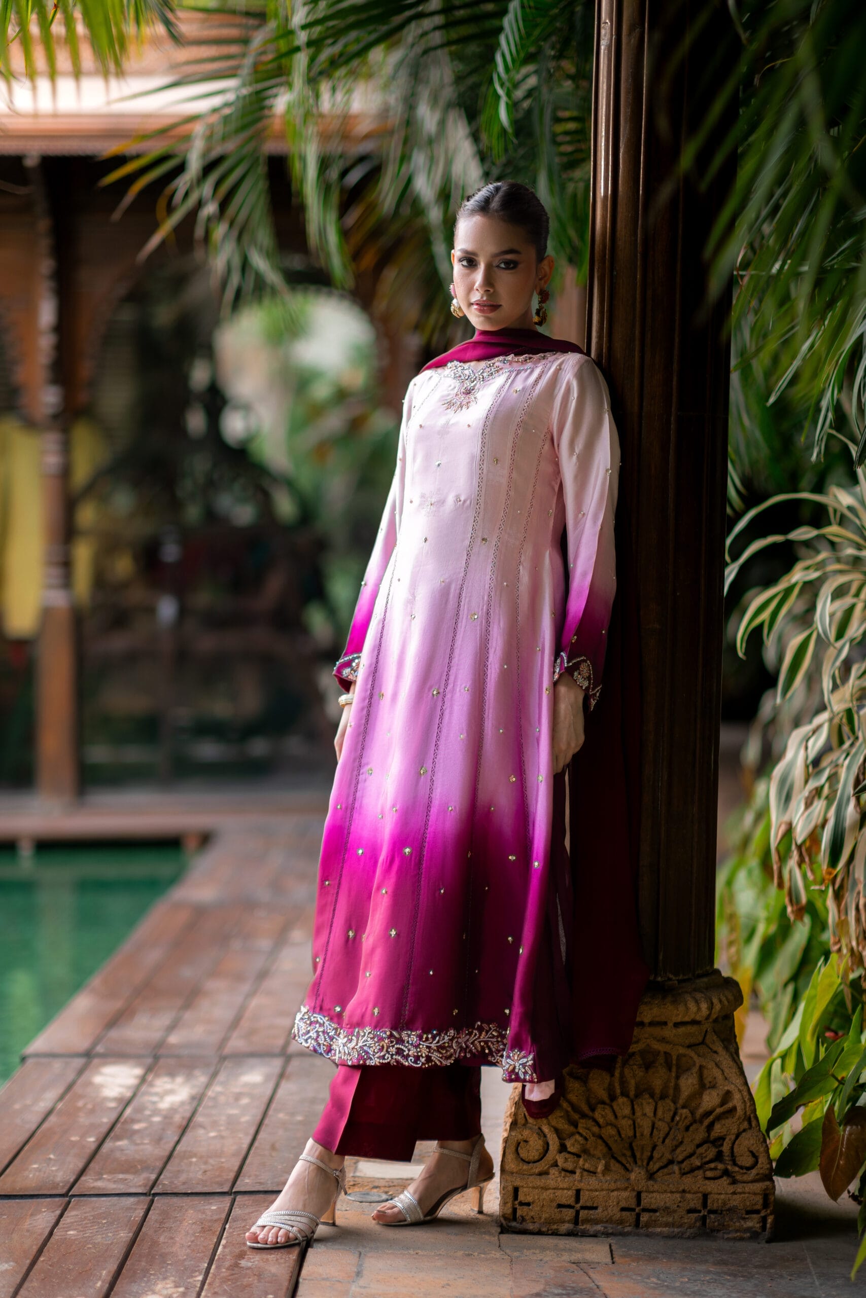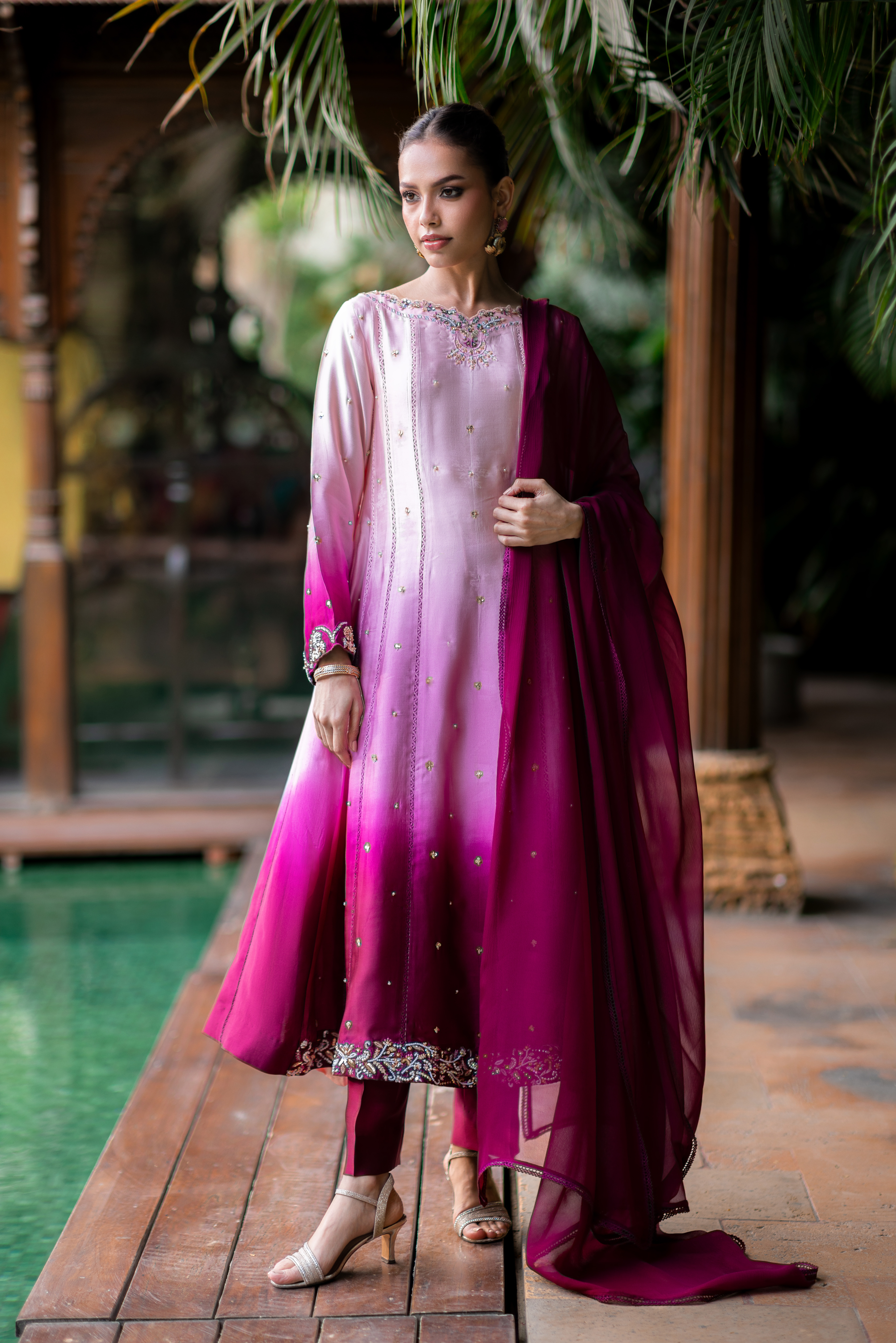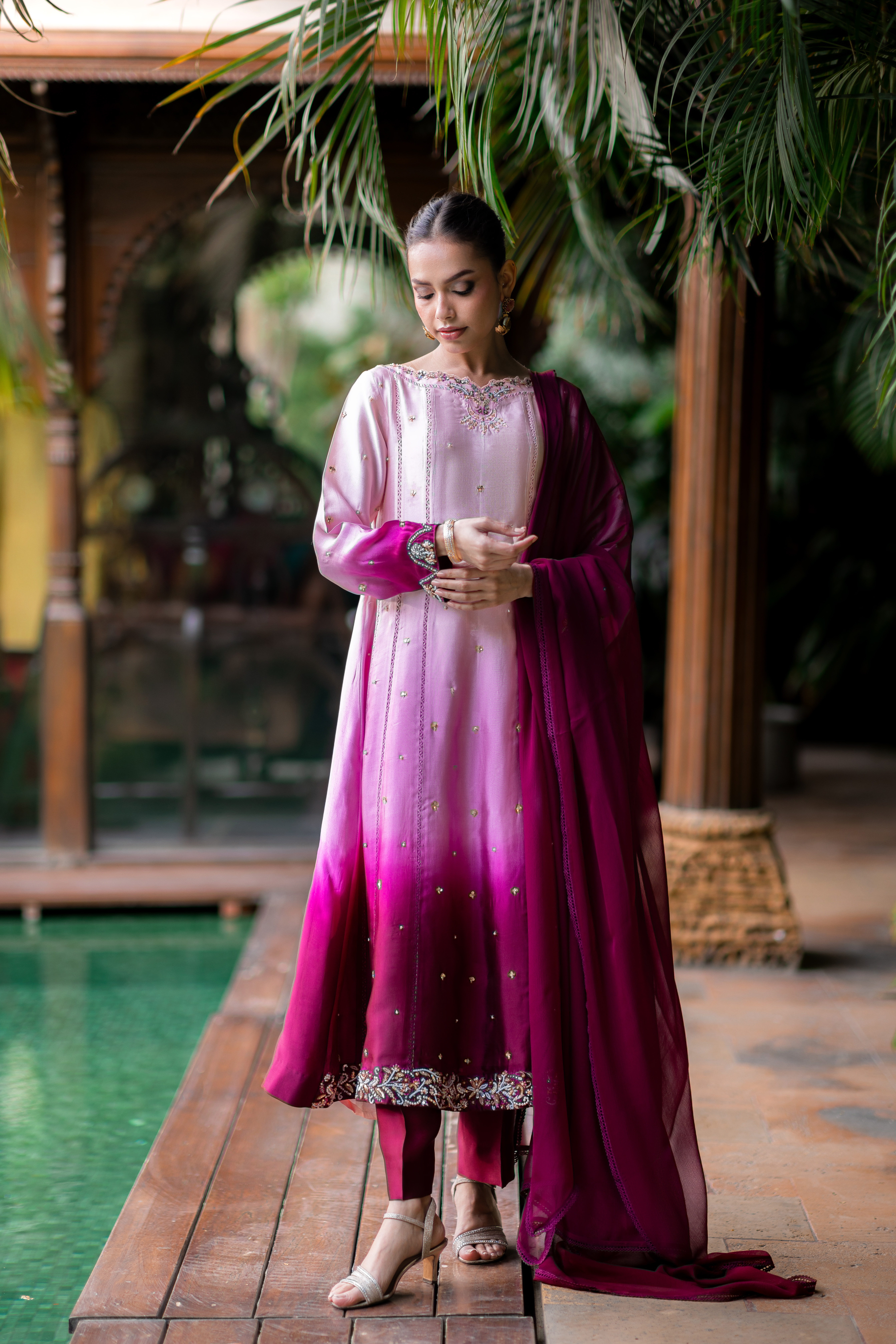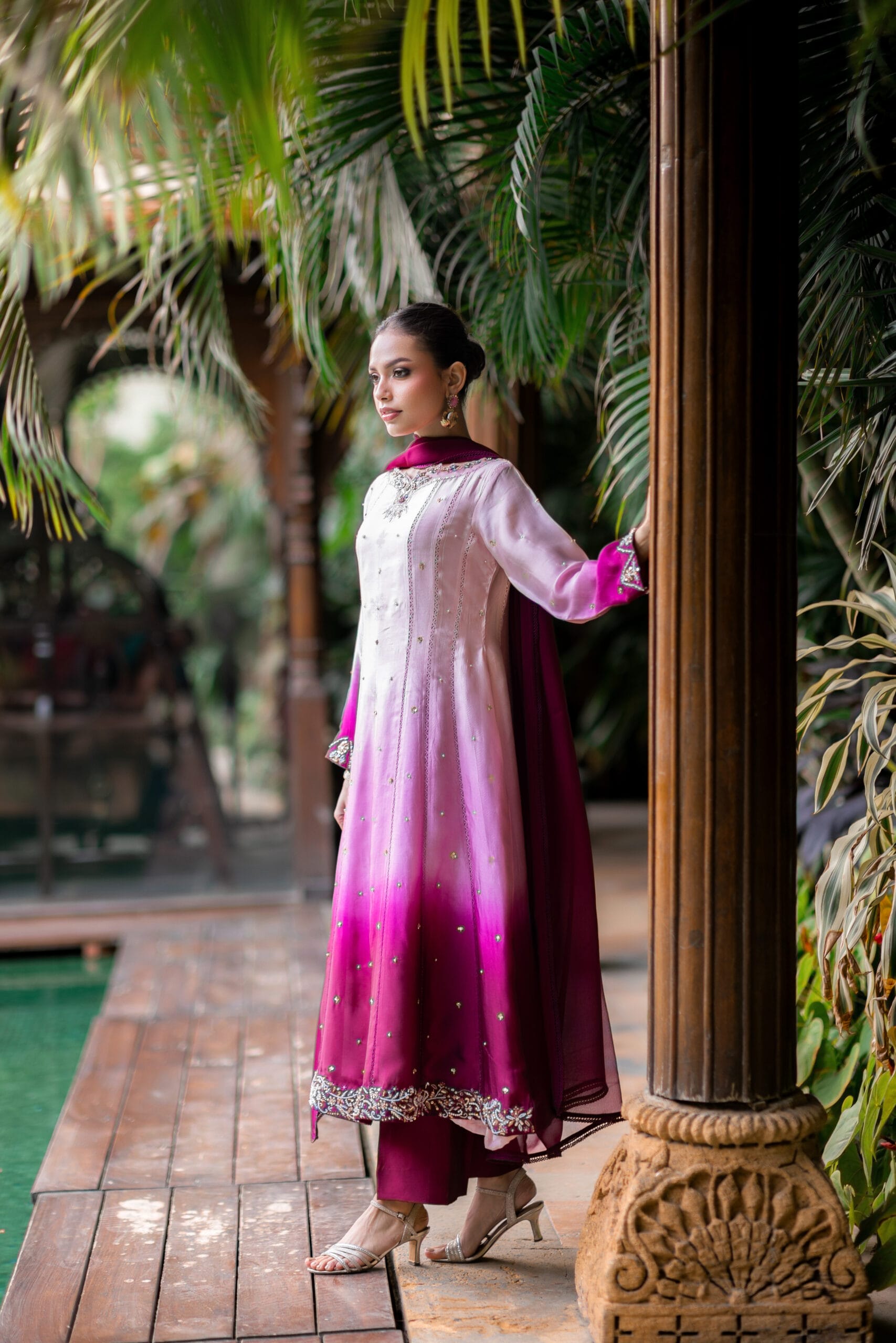 The hues of pink and magenta ombré long kalidar, a signature style for festive wear, is beautifully adorned with intricate handwork all over. Its elegant detailing makes it a perfect choice to be styled for any festive celebration.