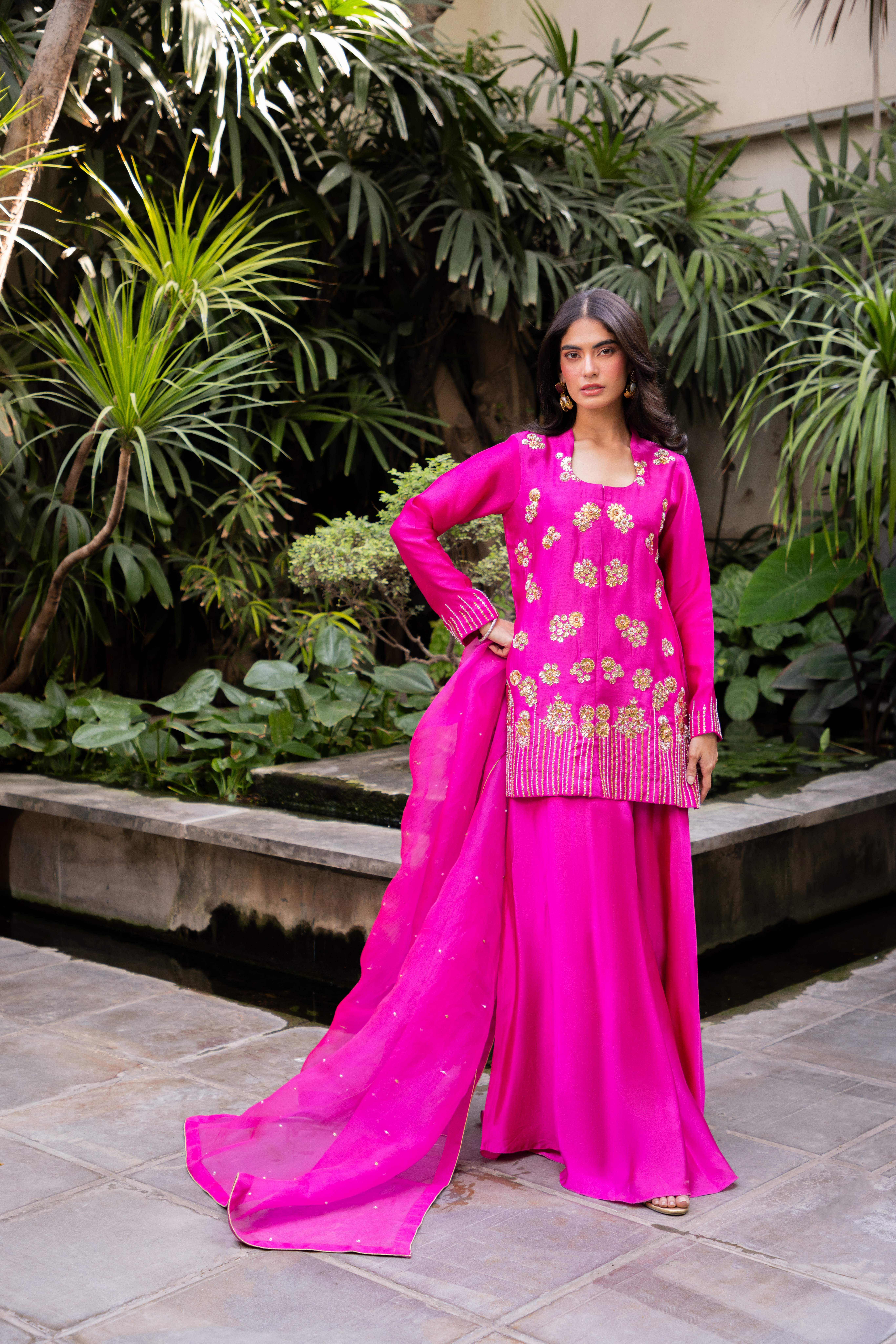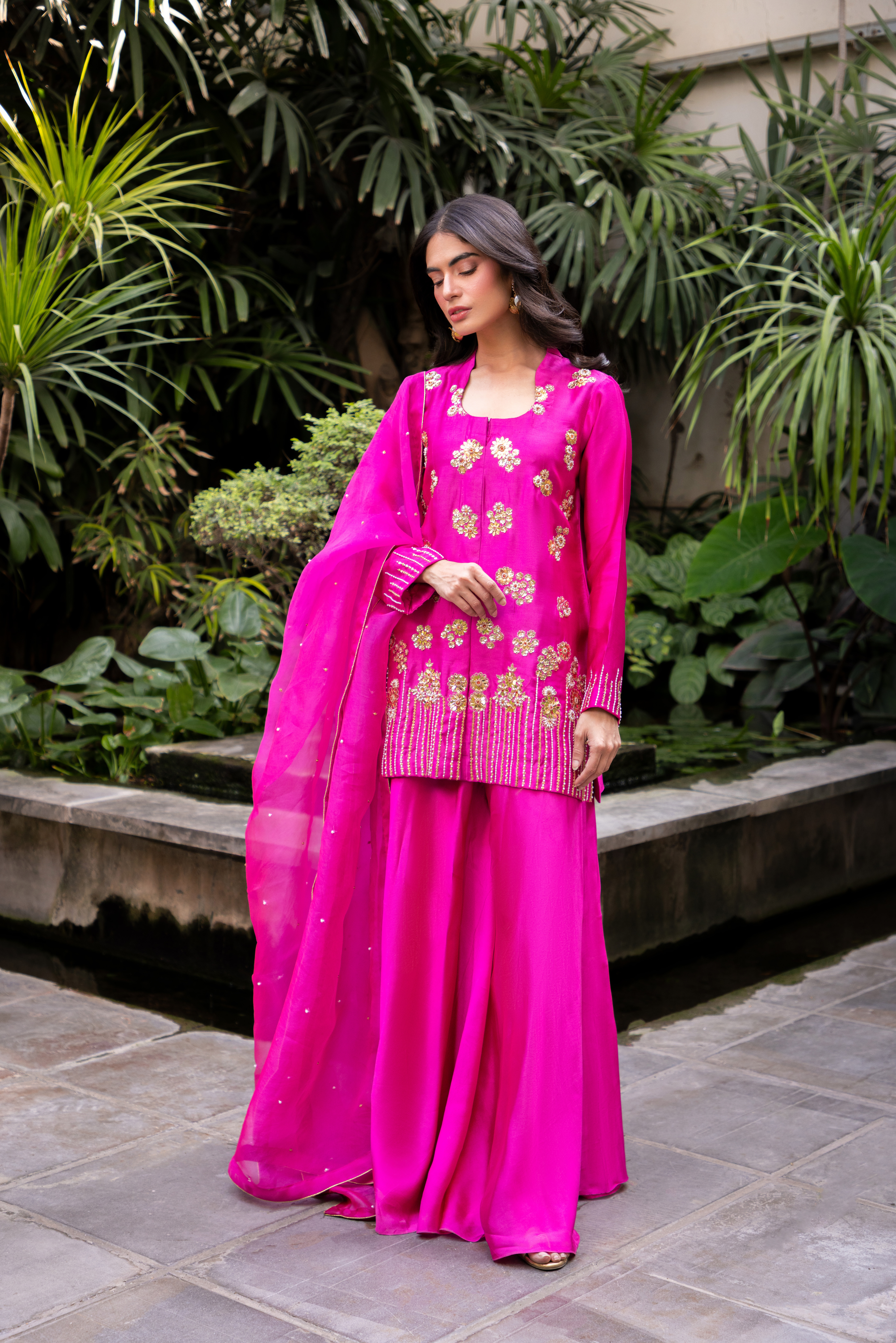 The front-open deep pink ensemble, adorned with all-over gold sequin work, reflects a modern and on-trend aesthetic. Paired with a Dhaka pajama, it beautifully enhances the overall elegance and appeal.