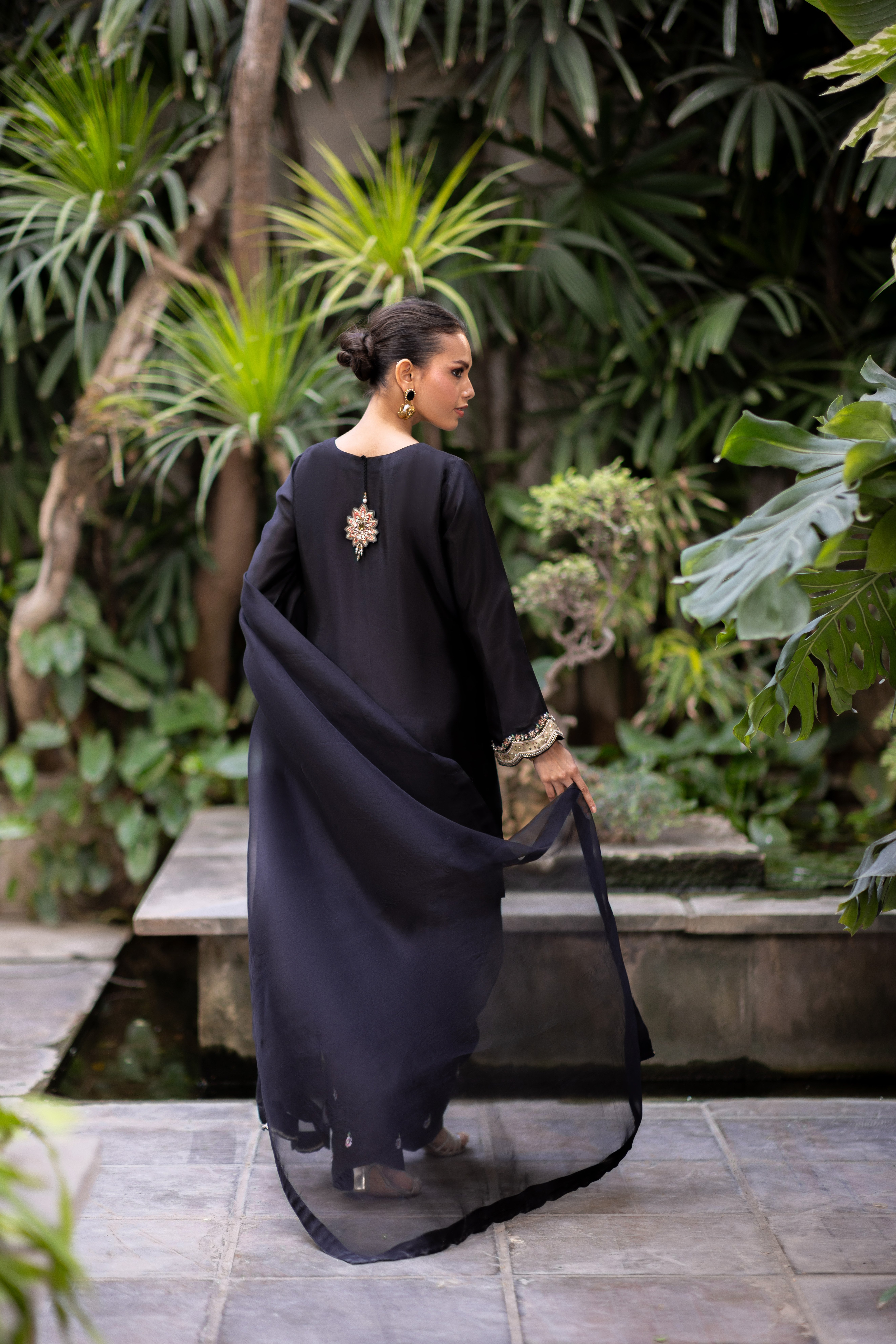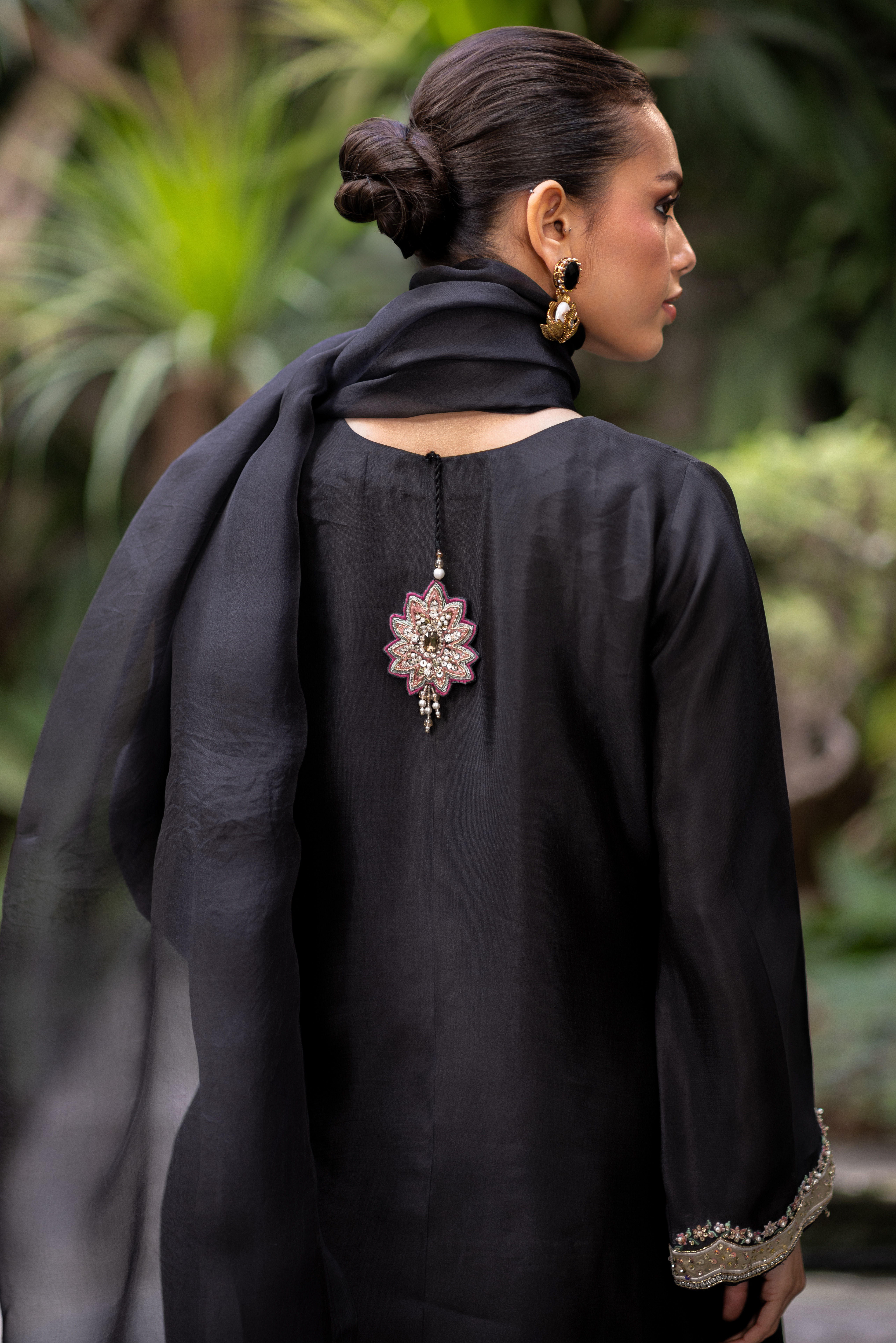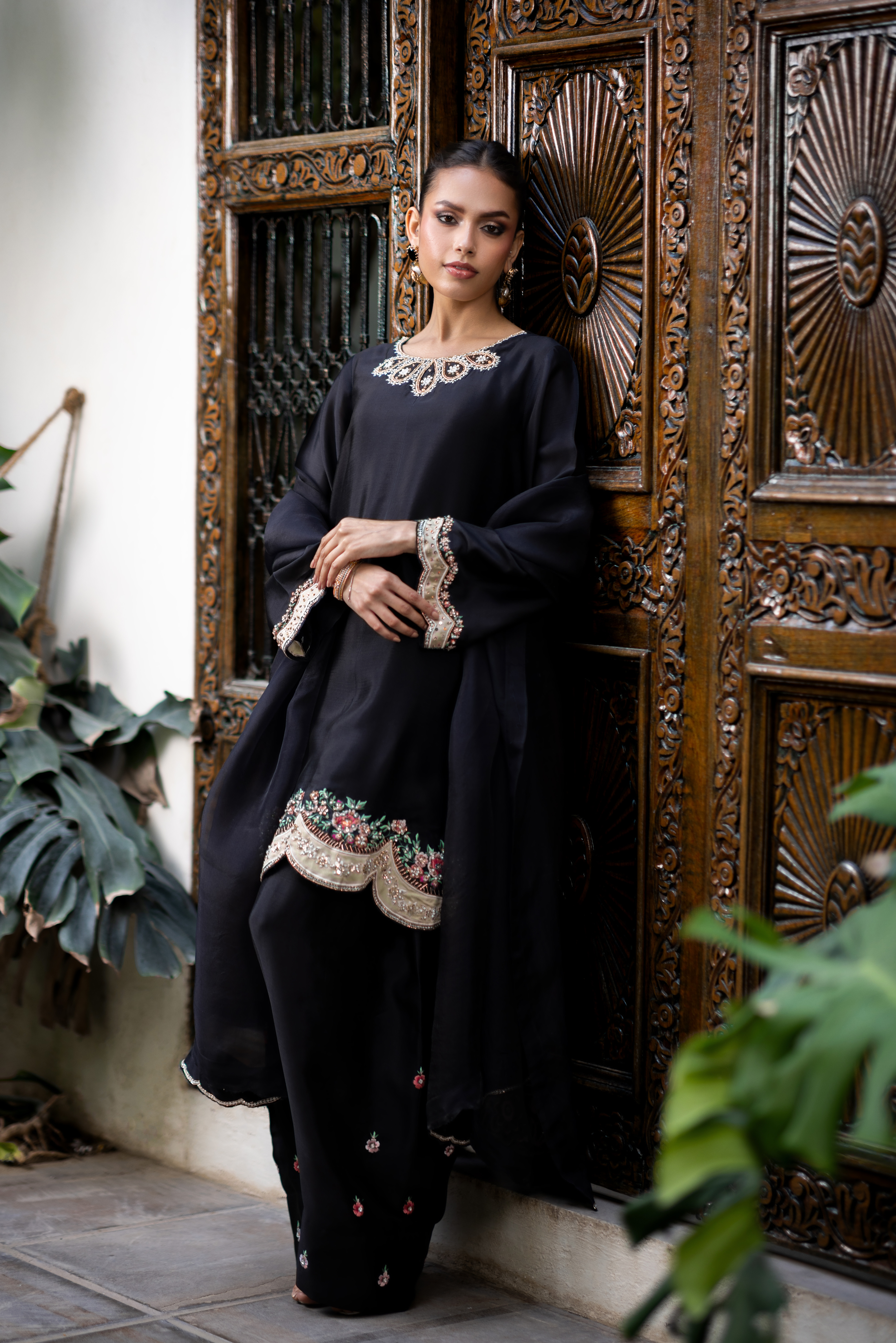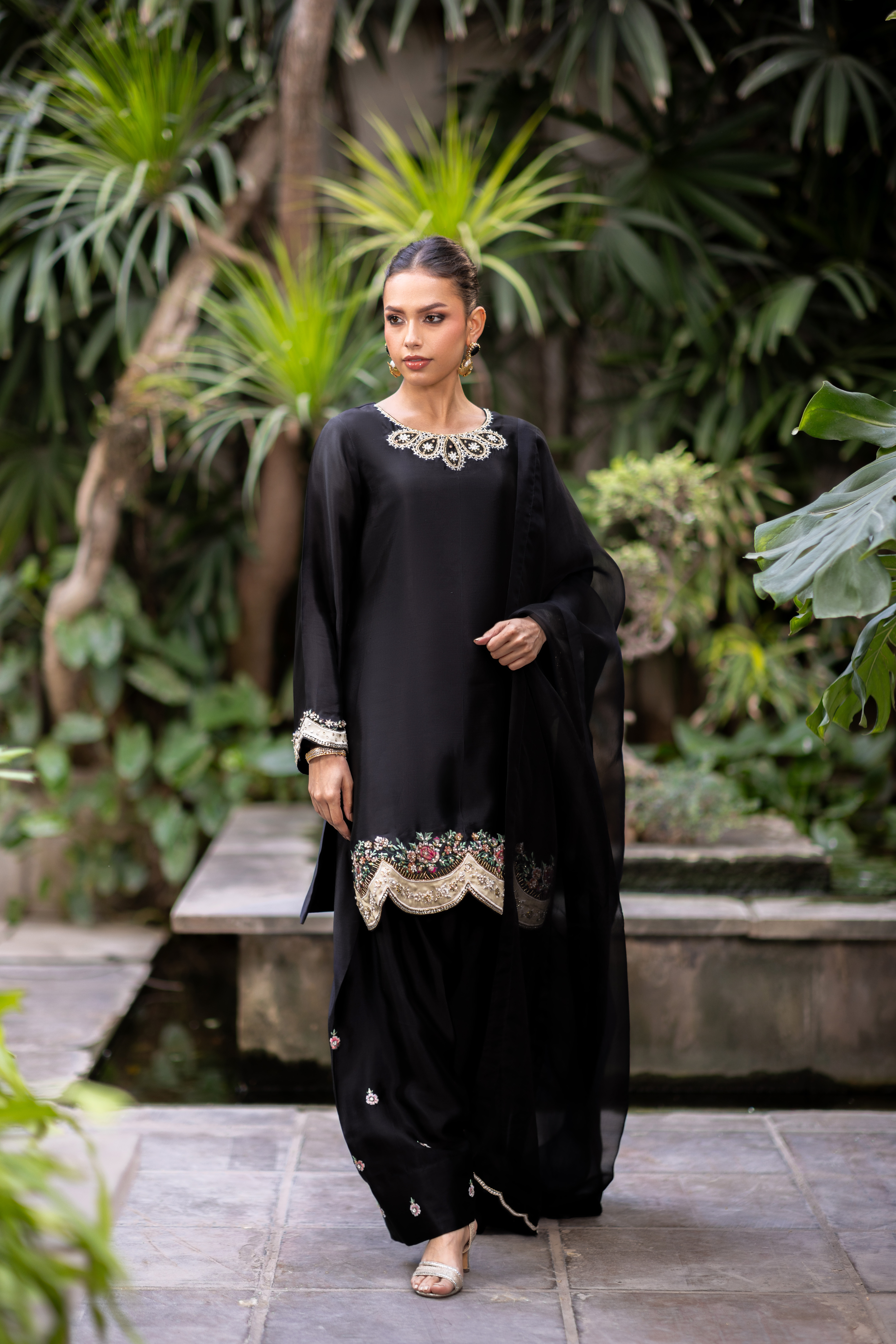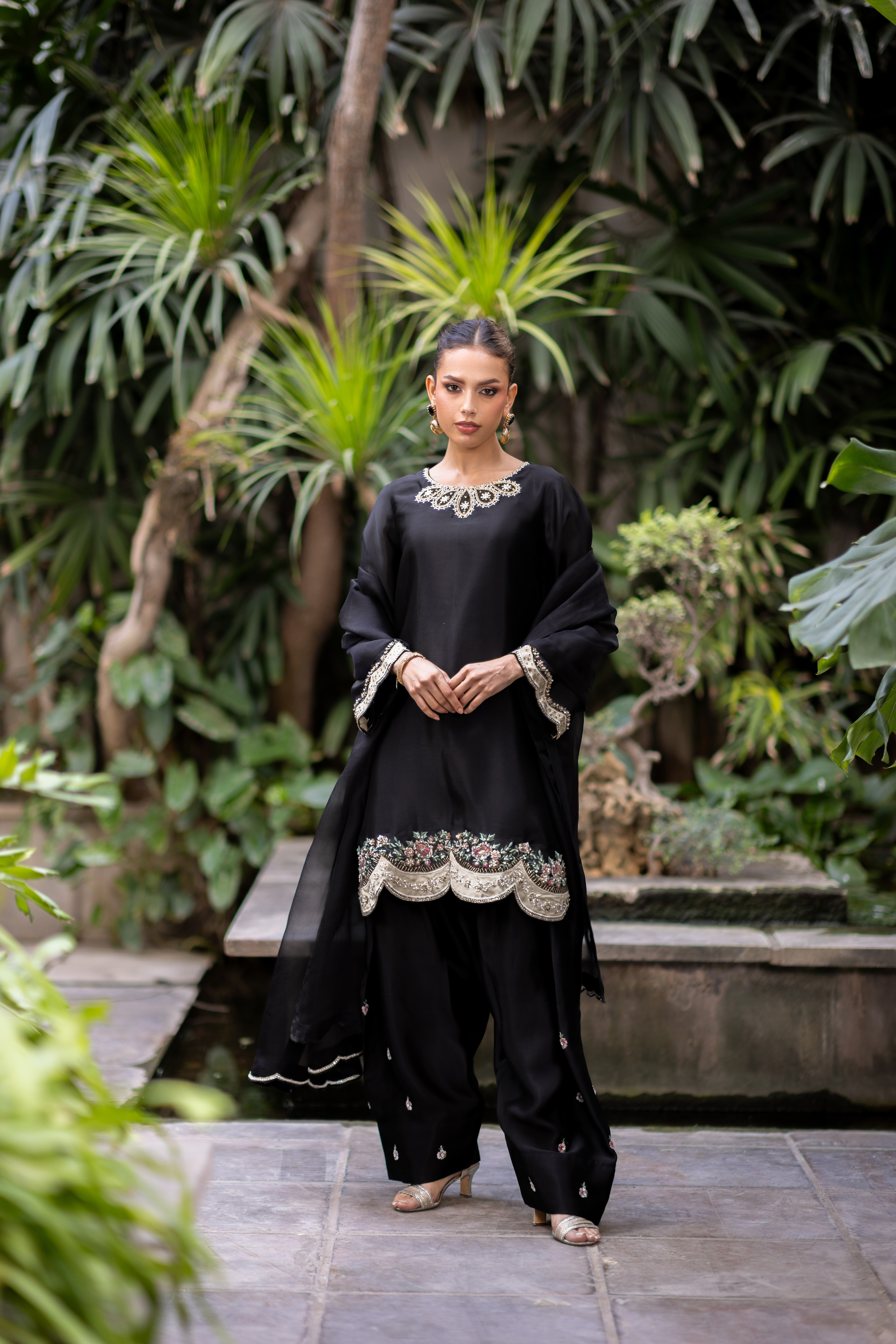 The black short shirt paired with a Farshi shalwar features elegant appliqué work on the daman and sleeves, while the delicate tassel detailing adds a refined touch, enhancing the overall beauty of the ensemble.
